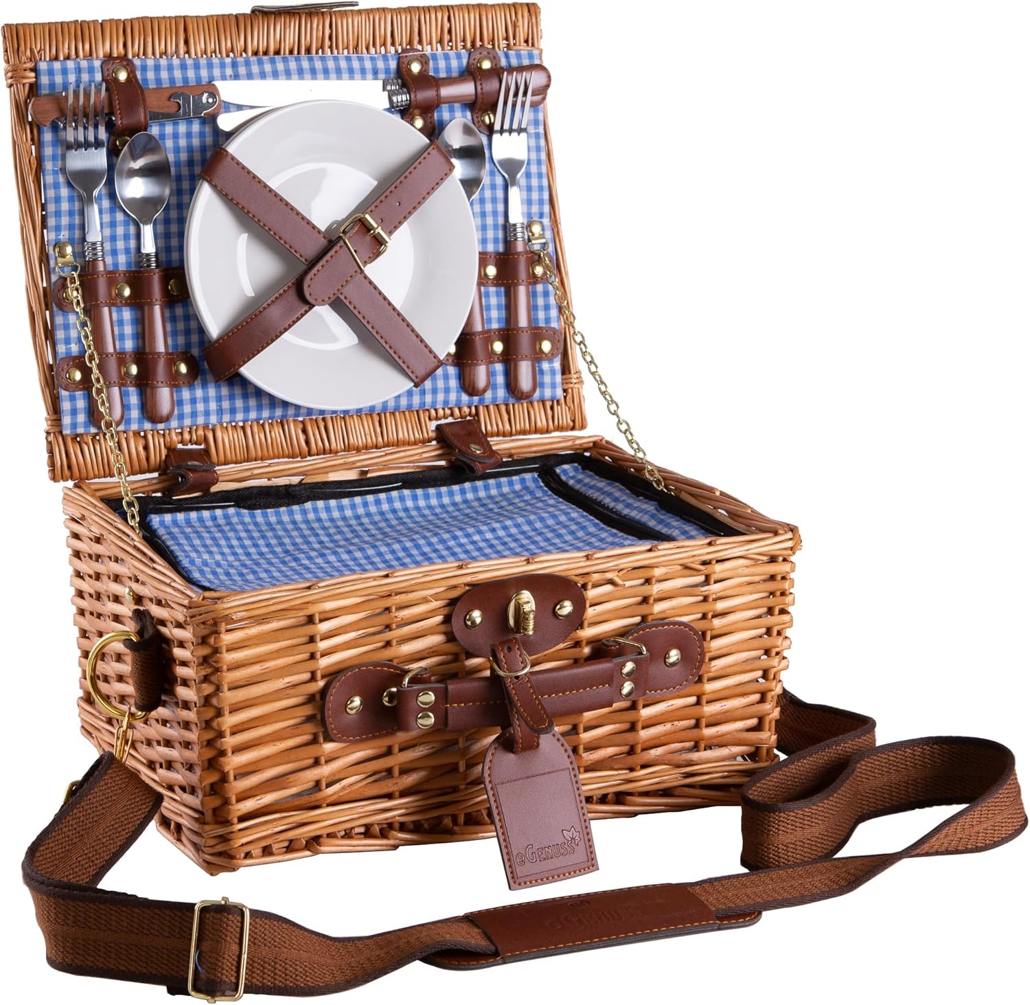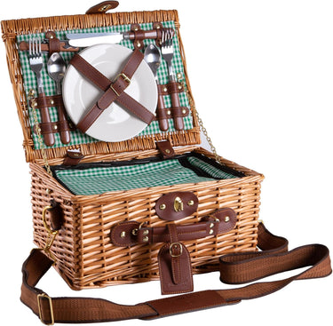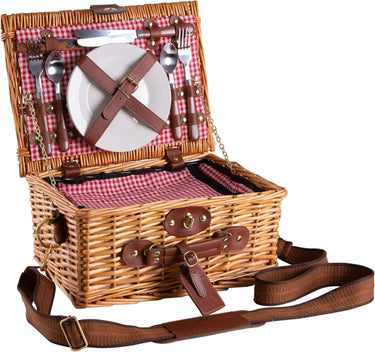 El dokuması doğal söğüt ve kırmızı gingham kumaşla şıklığı buluşturan eGenuss 2 kişilik piknik sepeti; omuz askısı, soğutma bölmesi ve tam aksesuar setiyle her an keyfe hazır. Şık ve işlevsel hediye alternatifi.