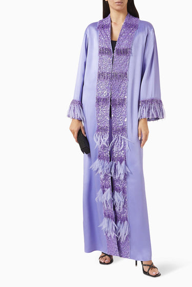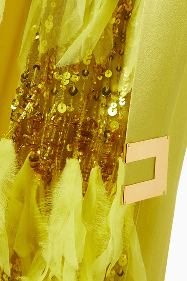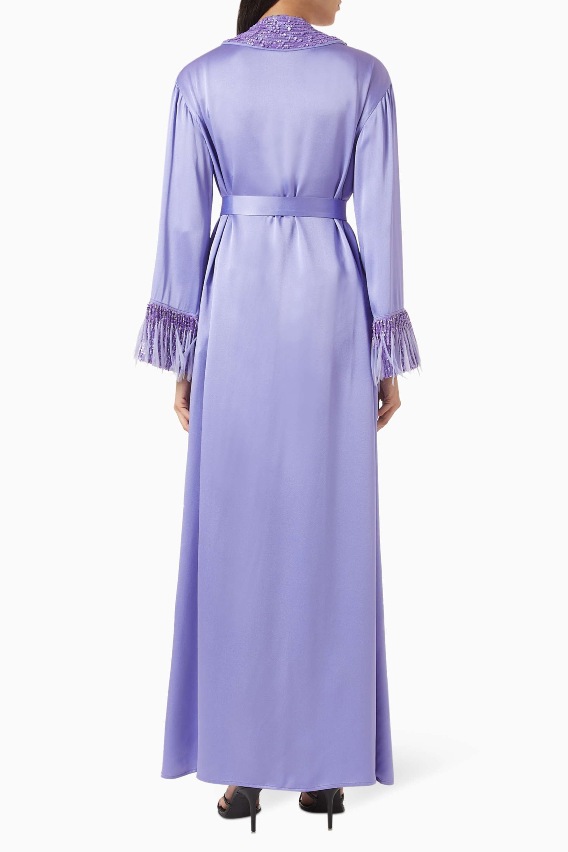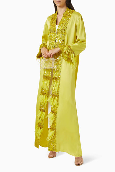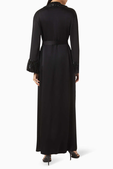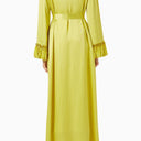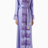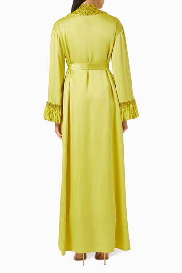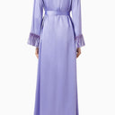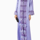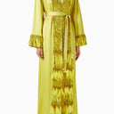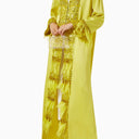 Şık İpek Kaftan Elbise Dantel İşlemeli Uzun Kollu ve Metal Kemerli Tasarım