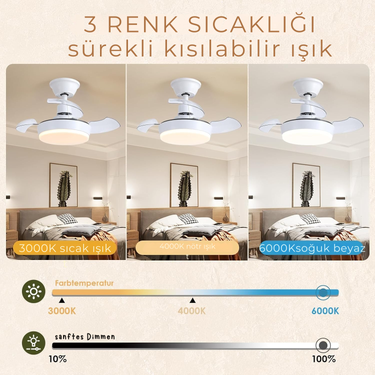 60 cm Işıklı Deckenventilator, Uzaktan Kumandalı, 3 Kanatlı, Beyaz