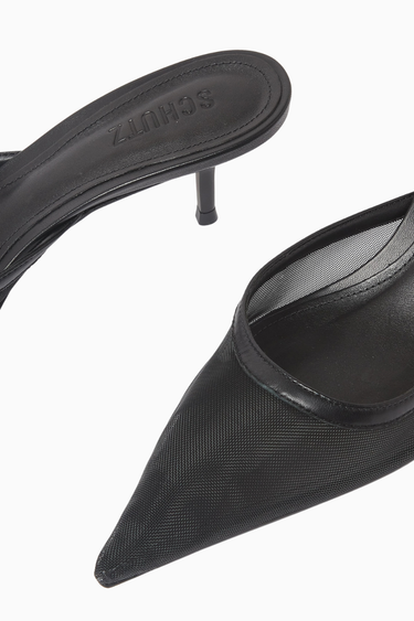 Schutz’ün mesh ve deri detaylı point-toe mules’leri, 63mm kitten topuk ile gündüzden geceye şıklık sunar. Slip-on tasarımı ve yumuşak deri tabanlarıyla hem rahat hem de zarif bir stil oluşturur.