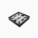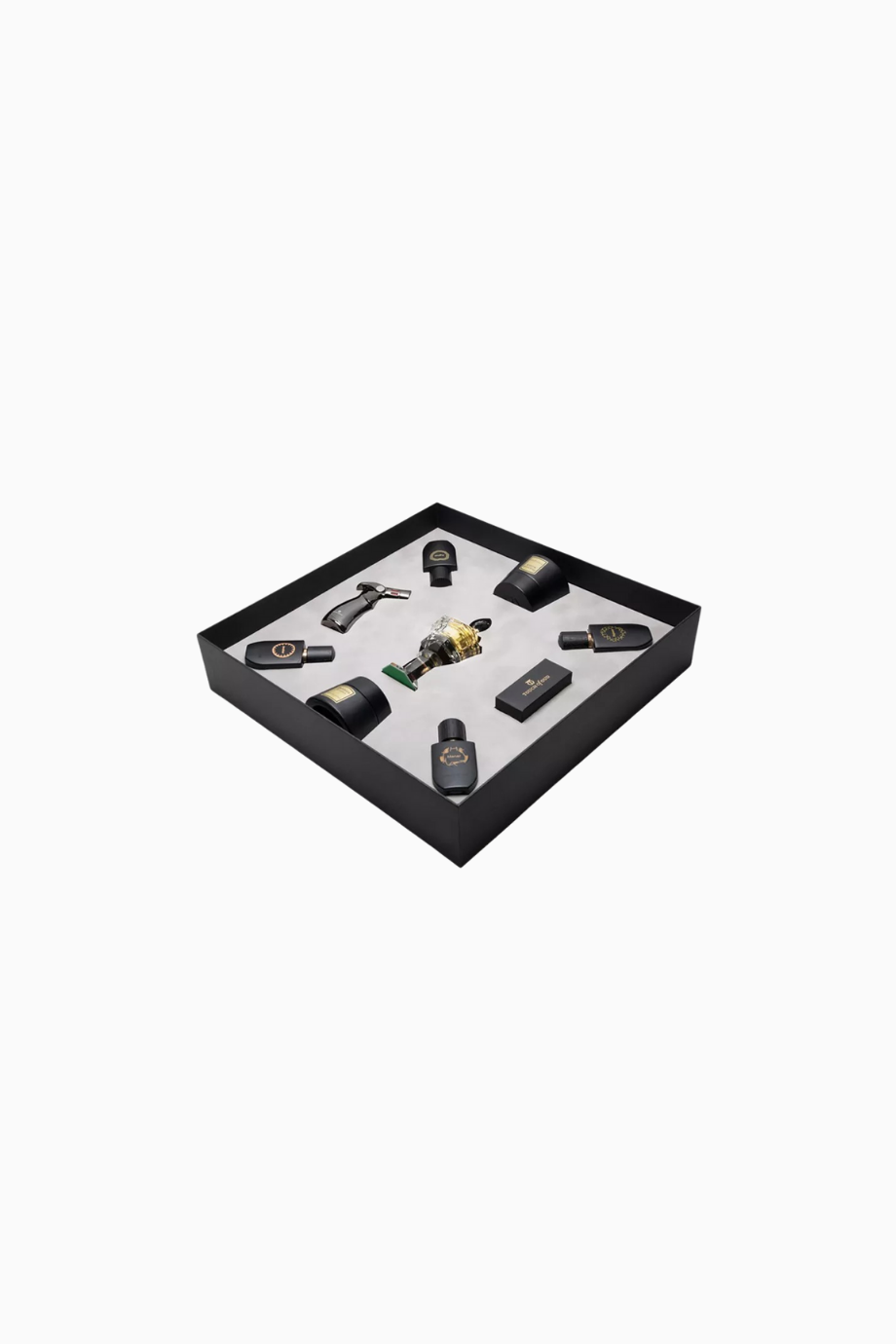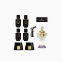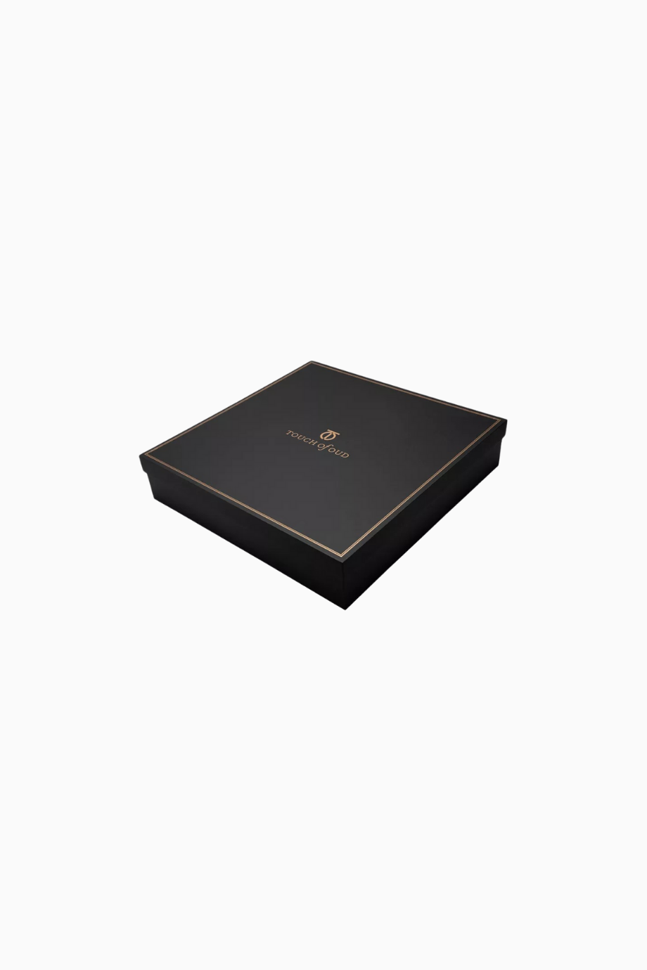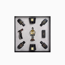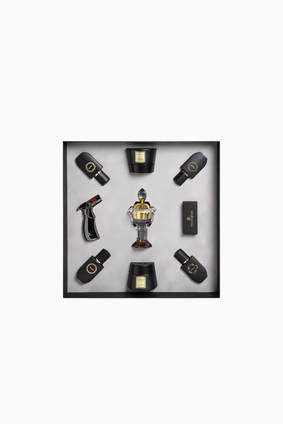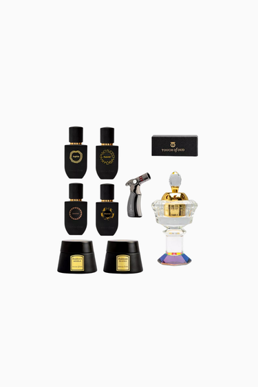 Touch Of Oud 9PCS Gift Set, dört özel parfüm, iki Dukhoon kavanozu, kristal mumluk, kömür ve çakmak içeren lüks bir set sunar. Evde veya özel günlerde oryantal aromalarla sofistike bir deneyim sağlar.