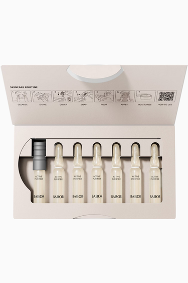BABOR Active Purifier Ampoule Serum, yağlı ve akneye meyilli ciltler için özel olarak geliştirilmiş yoğun bakım ampulleridir. Teebaum yağı ve antibakteriyel içerikleri sayesinde sivilce, siyah nokta ve cilt parlaklığına karşı etkili çözüm sunar.