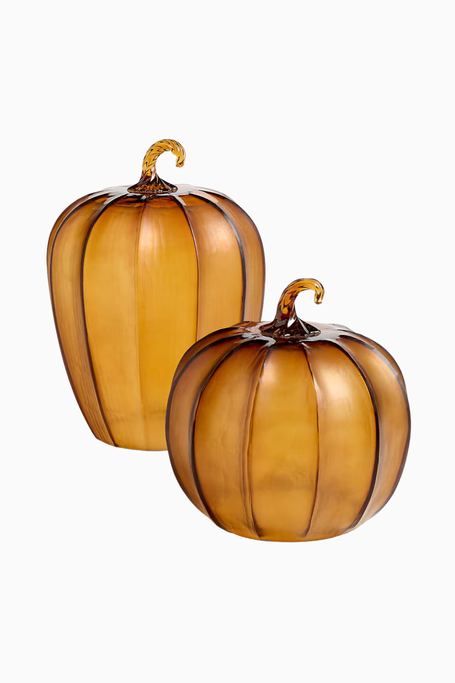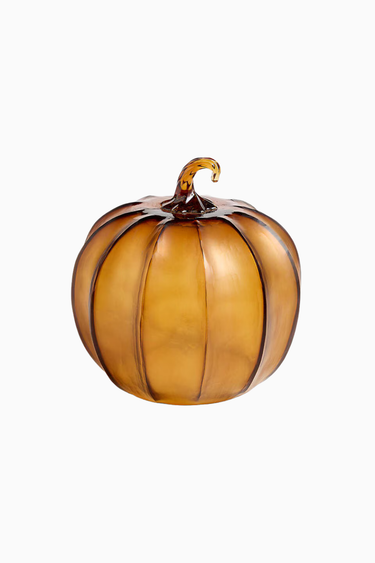 Amber Small Glass Pumpkin, klasik balkabağını lüks bir amber tonuyla yeniden yorumluyor. Camdan el yapımı ve mat yüzeyli bu kabak, sonbahar, Cadılar Bayramı ve Şükran Günü dekorunuza sofistike bir dokunuş katıyor. Alt kısmı açık tasarımıyla ışık veya mum yerleştirmeye uygundur.