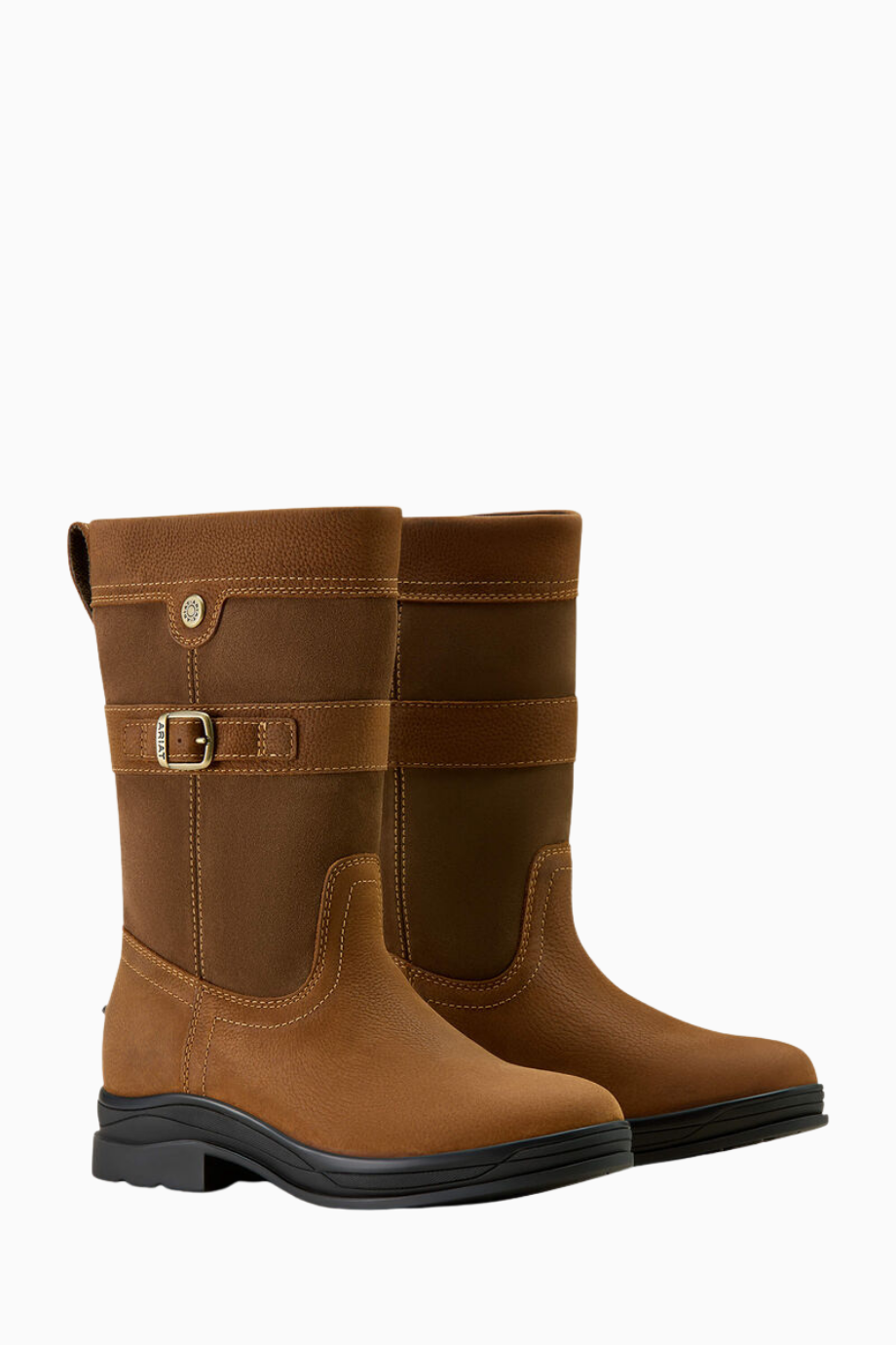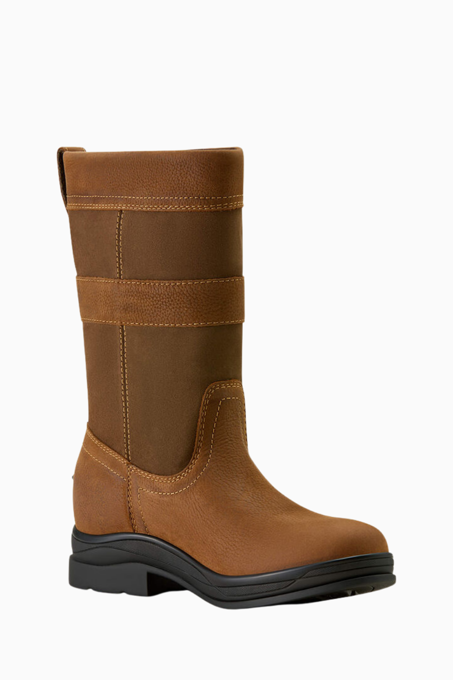 Ariat Bampton H2O kadın çizme, su geçirmez ve nefes alabilir DRYShield™ teknolojisiyle her koşulda konfor sağlar. Premium tam narin deri ve süet üst yüzeyi, dayanıklı Duratread™ tabanı ve anatomik iç tabanı ile hem binicilikte hem günlük kullanımda şıklık ve güven sunar.