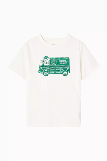 Polo Ralph Lauren Bear Truck Tişört, yumuşak pamuklu kumaşı ve sevimli ayı kamyonu baskısıyla çocuklar için konforlu ve şık bir günlük tişört sunar. Yuvarlak yaka ve zamansız tasarım.