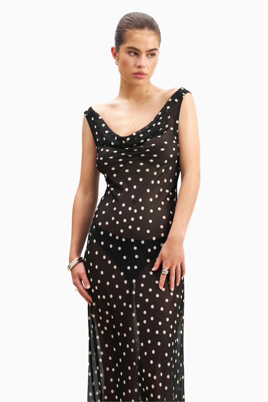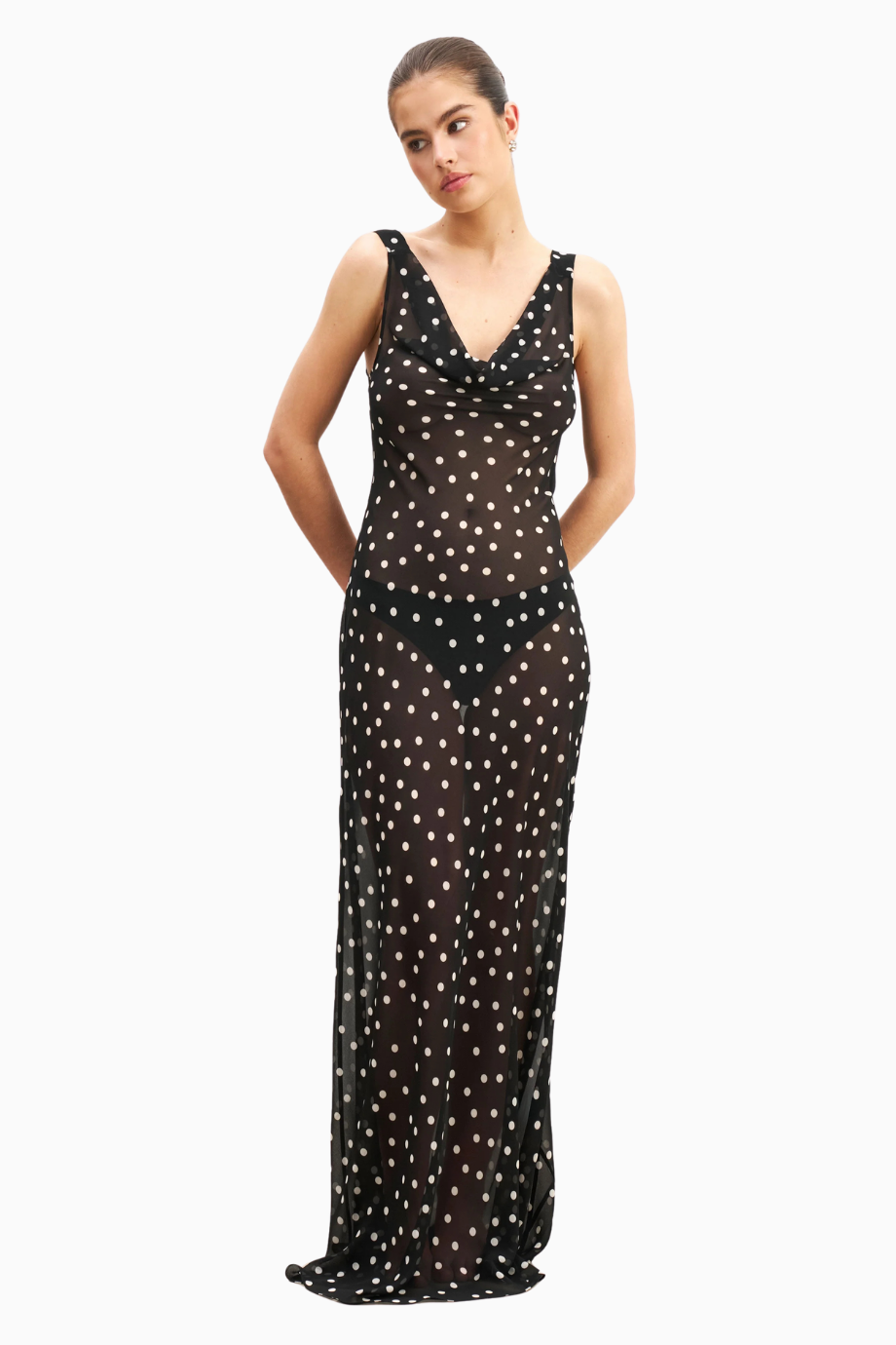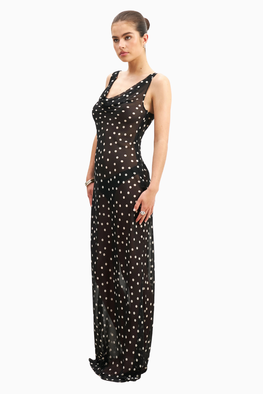 Chiffon Cowl Neck Gown Semi-Sheer Draped Maxi Dress Kadın Elbise