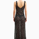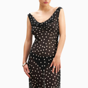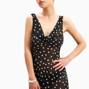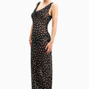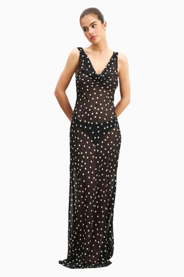 Because Of Alice Chiffon Cowl Neck Gown, zarif dökümlü yaka tasarımı ve yarı şeffaf şifon kumaşıyla feminen bir görünüm sunar. Bias kesim formu vücuda zarifçe otururken, uzun flared etek ve gizli yan fermuar detaylarıyla sofistike bir siluet oluşturur.
