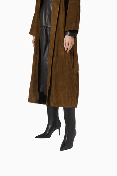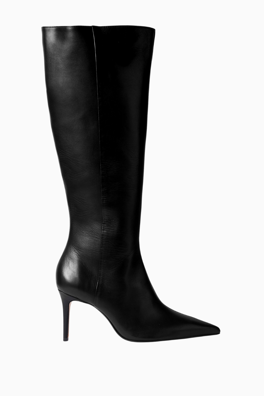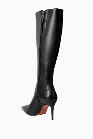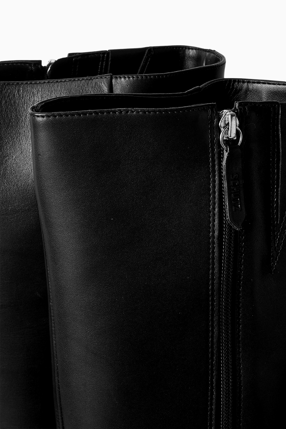 Schutz City Natural 85 siyah deri diz boyu çizme, zarif silueti ve 85mm blok topuğu ile şehre uygun sofistike bir görünüm sunar. Midi etekler ve dar paça pantolonlarla mükemmel uyum sağlar.