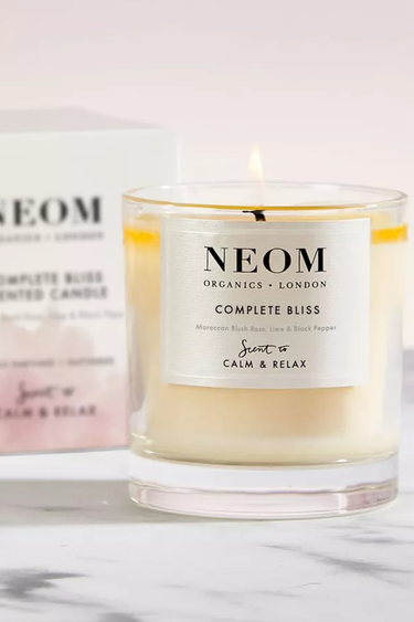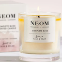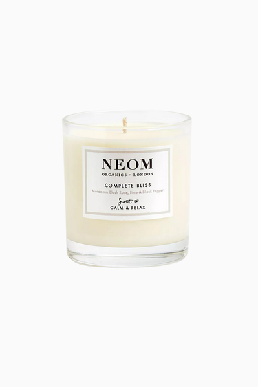 Neom Organics Complete Bliss Scented Candle 185g, Fas gülü, taze limon ve hafif karabiber notalarıyla hazırlanmış %100 doğal mumdur. 35 saat boyunca yanarak ruhu sakinleştirir ve evinizde tam huzur dolu bir atmosfer yaratır.