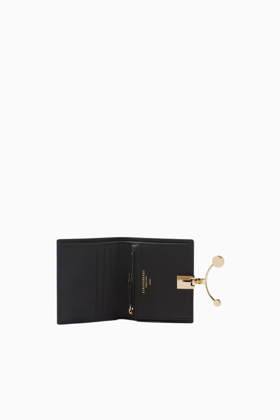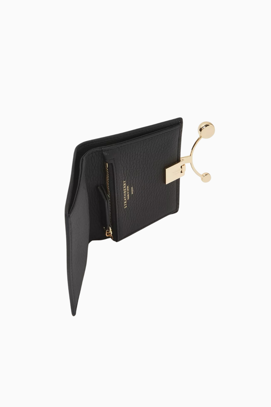 Strathberry Crescent Wallet, İspanya’da el yapımı yumuşak dana derisinden üretilmiştir. Gold donanımlı imza bar ve menteşeli kapama ile şık bir tasarım sunar. 4 kart bölmesi, not bölmeleri ve fermuarlı iç cep ile düzen sağlar.