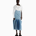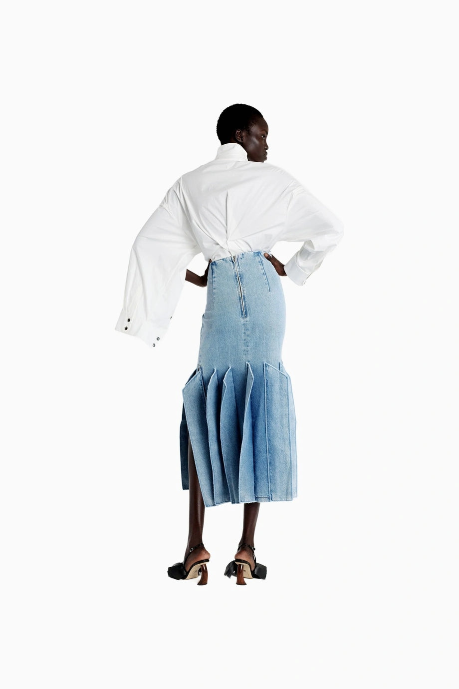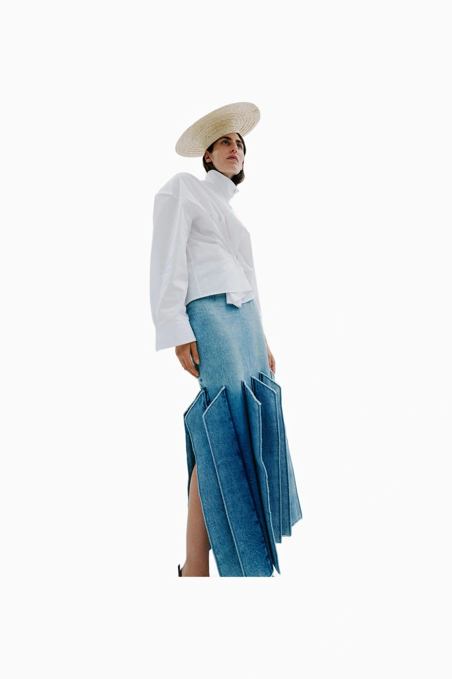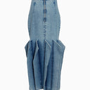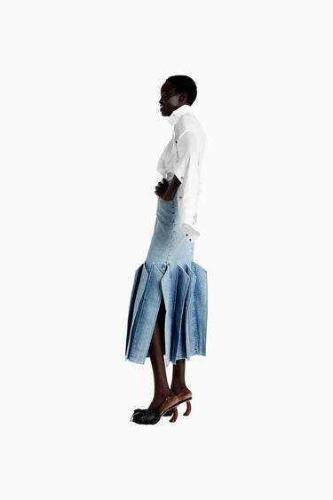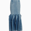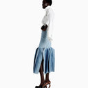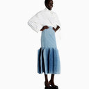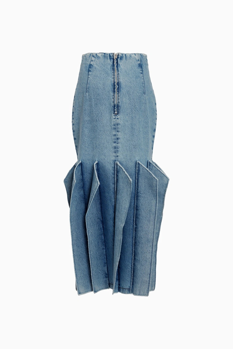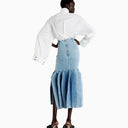 Panel detaylı, orta mavi denim etek. Yüksek belli, bele oturan ve 3D etek panelleriyle hacimli, kloş kesim. %100 pamuk. Kuru temizleme. Paraguay'da üretilmiştir.
