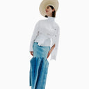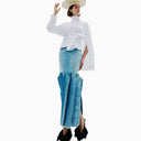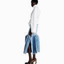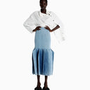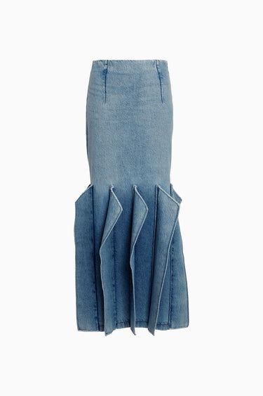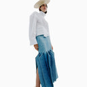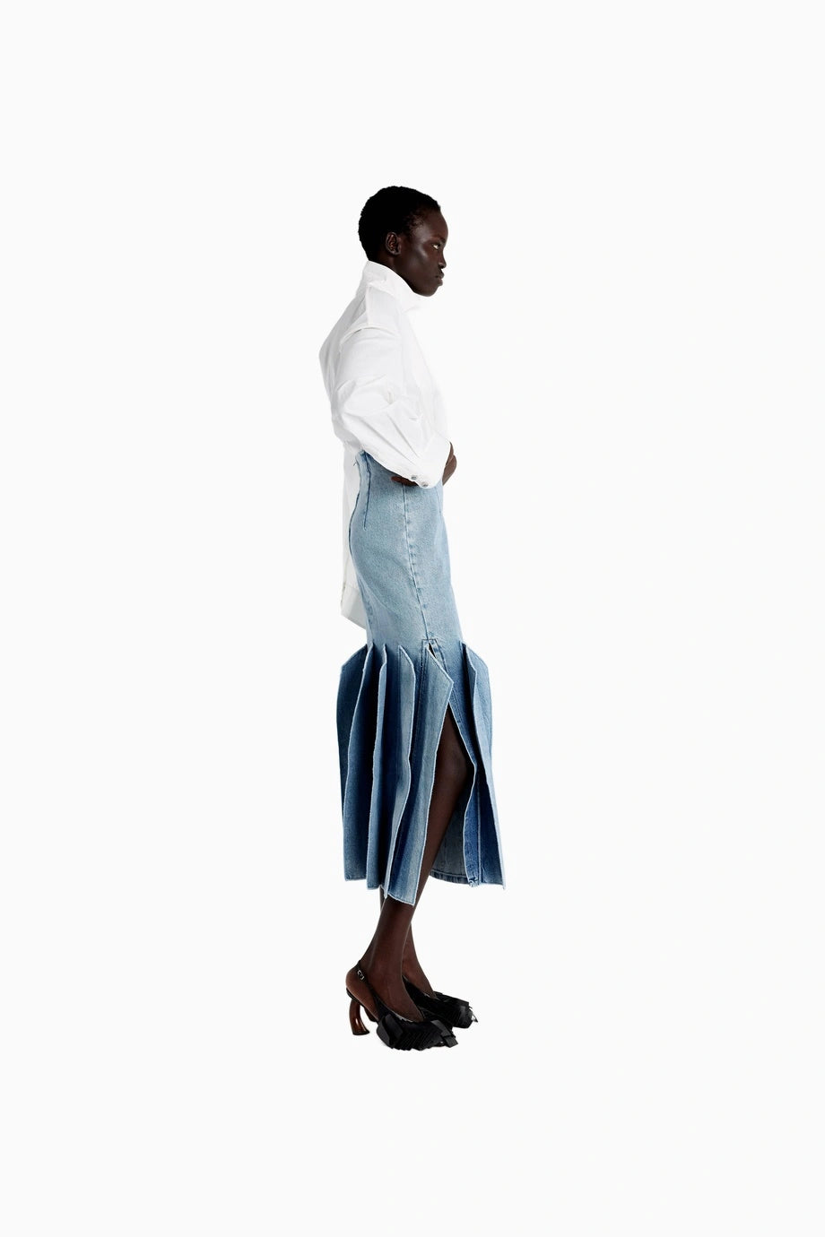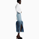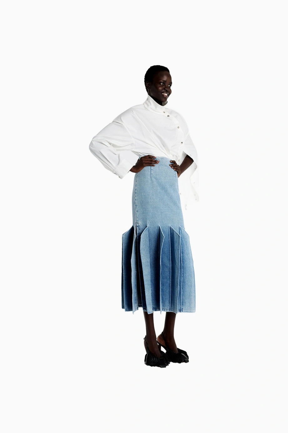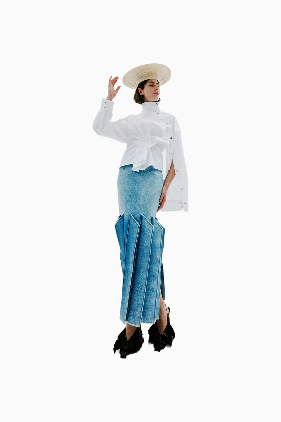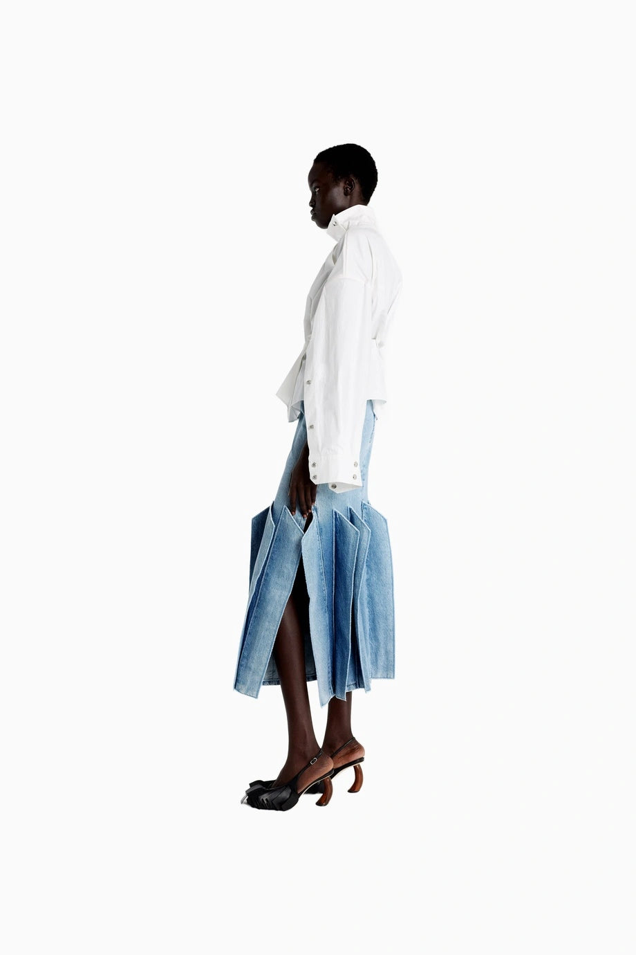 Panel detaylı, orta mavi denim etek. Yüksek belli, bele oturan ve 3D etek panelleriyle hacimli, kloş kesim. %100 pamuk. Kuru temizleme. Paraguay'da üretilmiştir.