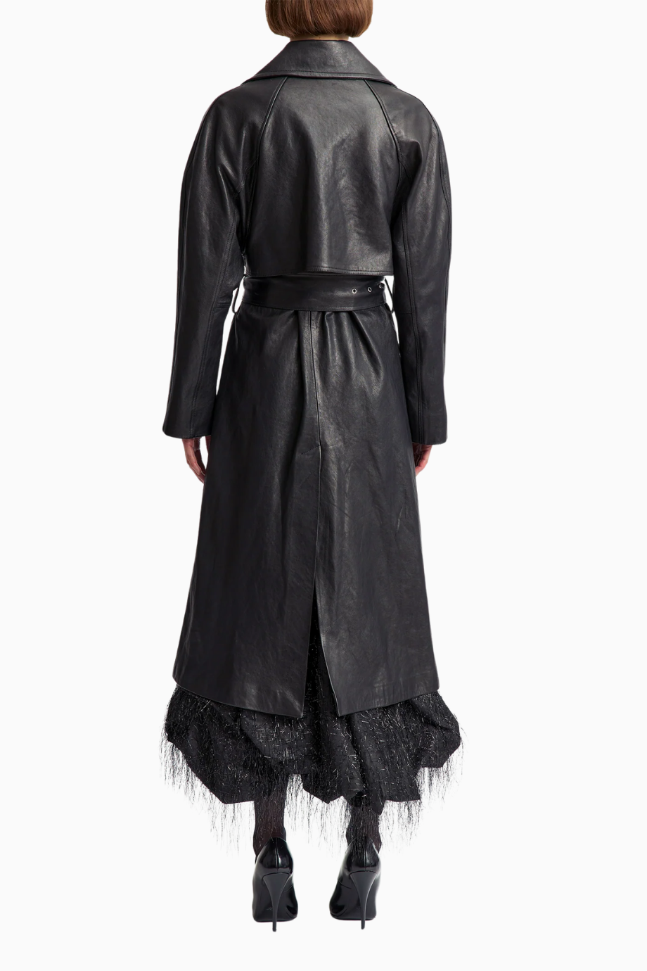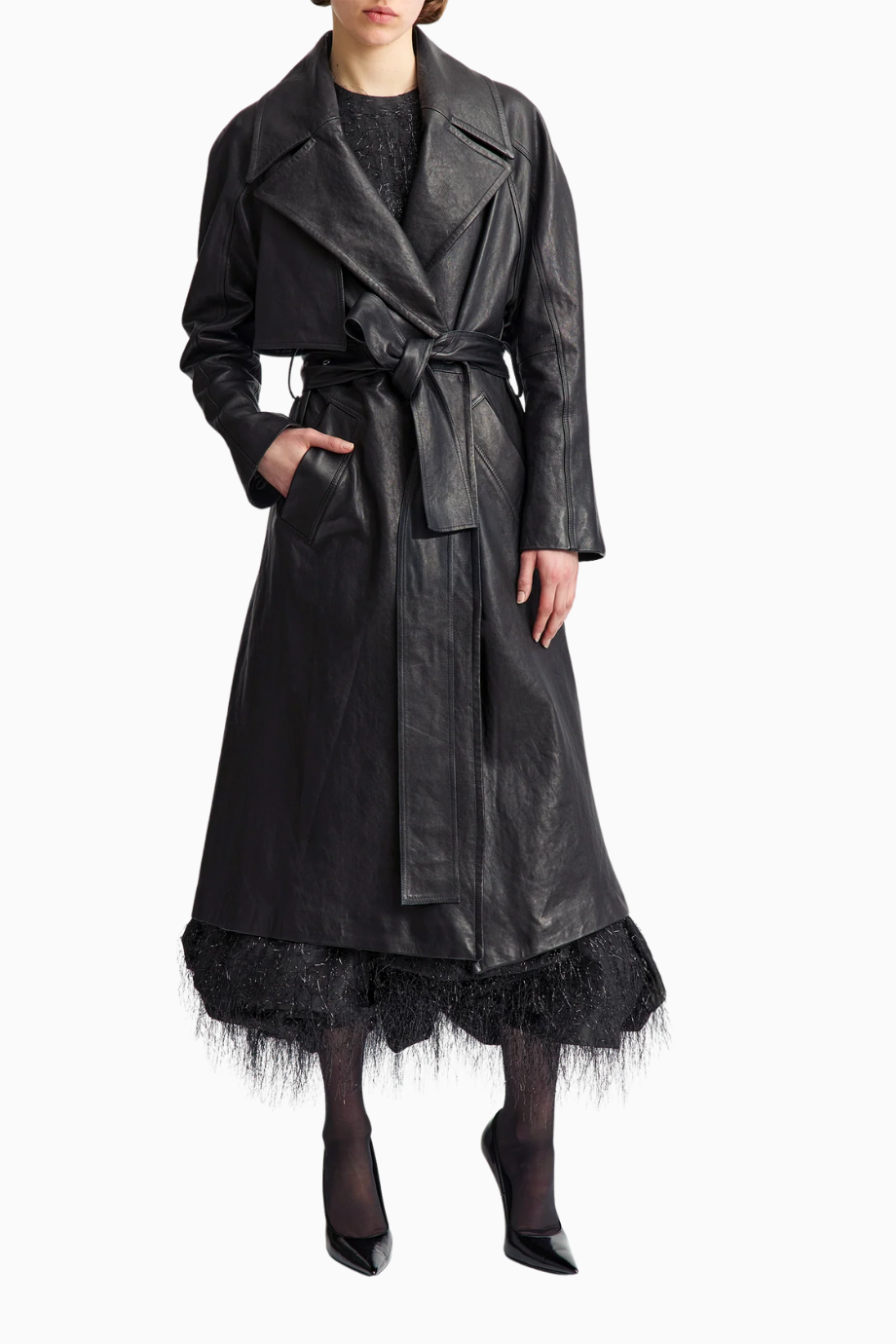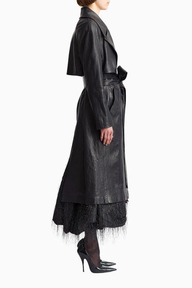 Ettora Mini Elbise, siyah viskon kumaştan üretilmiş, zarif ve yapılandırılmış bir tasarımdır. Balıkçı yaka, uzun kollar ve beldeki kemer detayıyla sofistike bir siluet sunar.