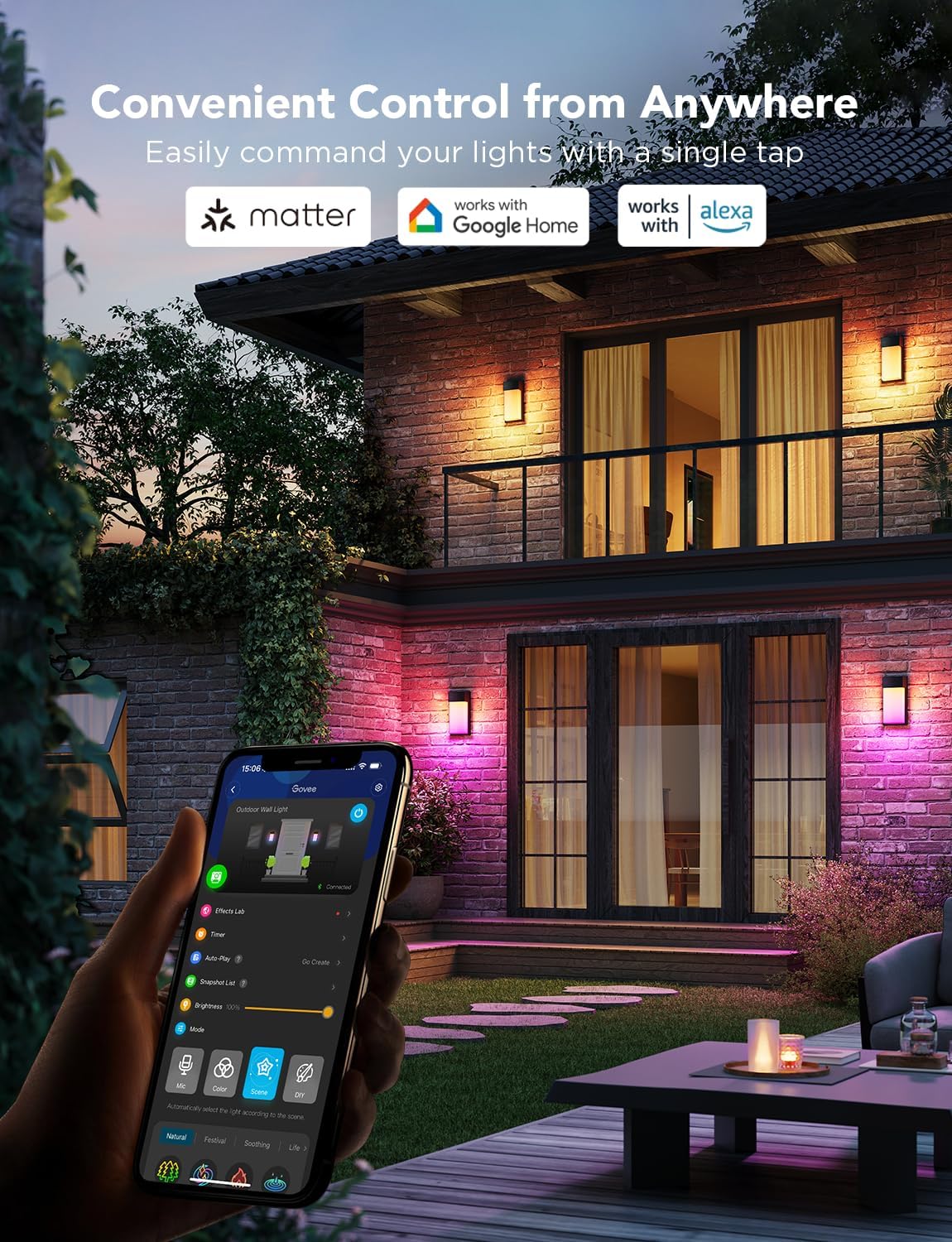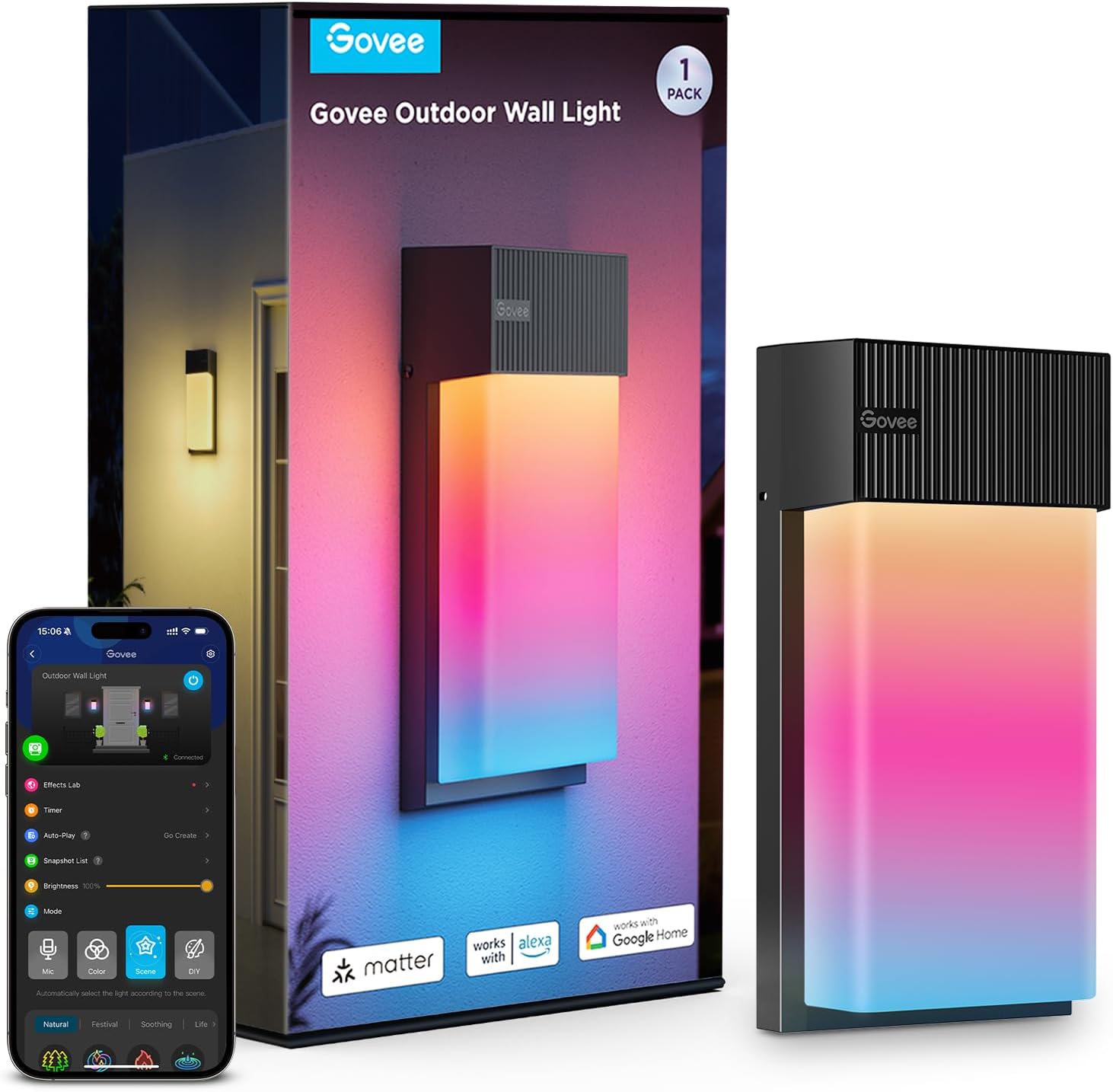 Govee RGBIC dış mekan duvar lambası, tekli paketinde 1500 lümen aydınlatma ve 45 sahne modu sunar. IP65 su geçirmez gövdesi ile her hava koşuluna dayanıklıdır. Govee Home uygulamasıyla kişiselleştirilebilir, Alexa, Google Assistant ve Matter ile akıllı evinize entegre edilebilir.