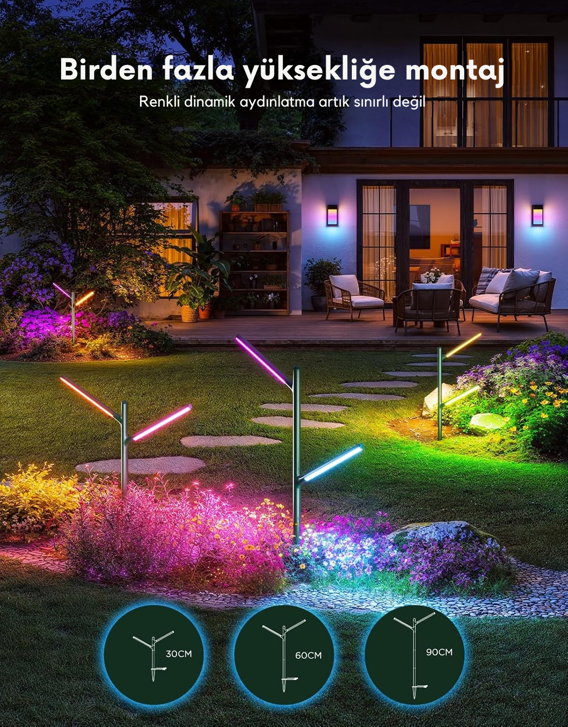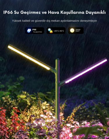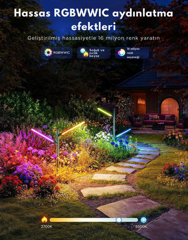 Govee Dış Mekan LED Bahçe Lambası, 16 milyon renk seçeneği ve 64 sahne modu ile bahçenizde dinamik bir ışık atmosferi yaratmanızı sağlar. RGBWWIC teknolojisi, tam spektrumlu beyaz ışık ile bitkilerin gerçek renklerini vurgular. Kendin yap yüksekliği ayarları, farklı yüksekliklerde montaj imkanı sunarak bitkilerinizi ve bahçe alanınızı mükemmel şekilde aydınlatır. IP66 su geçirmez ve dayanıklı alüminyum yapısı ile zorlu hava koşullarına dayanıklıdır. Alexa, Google Assistant ve Matter uyumluluğu ile kolayca kontrol edilebilir.