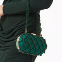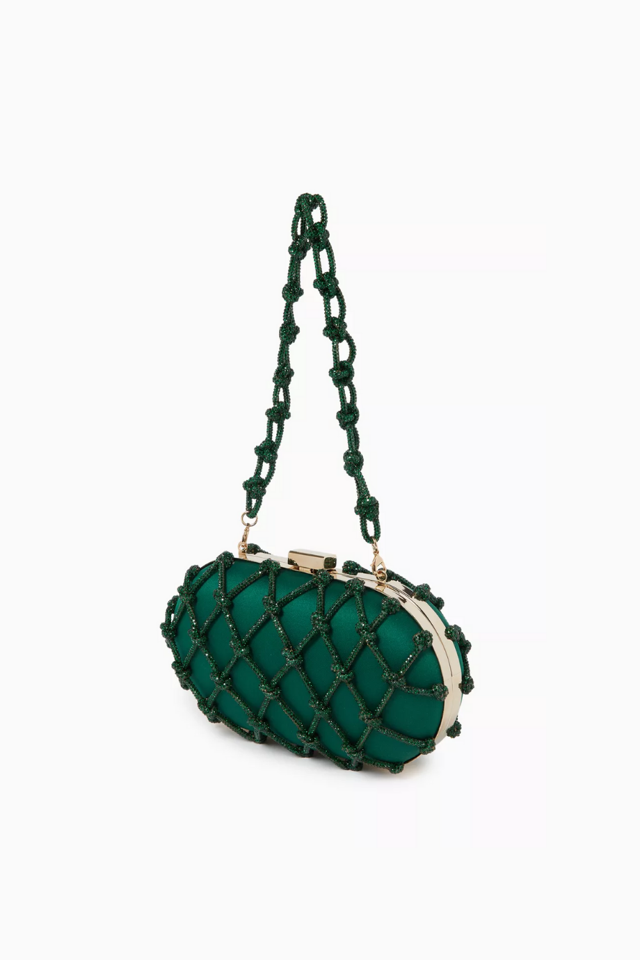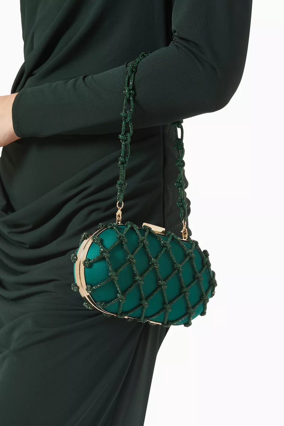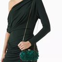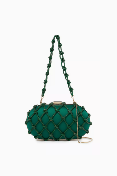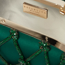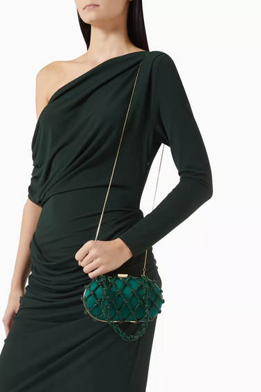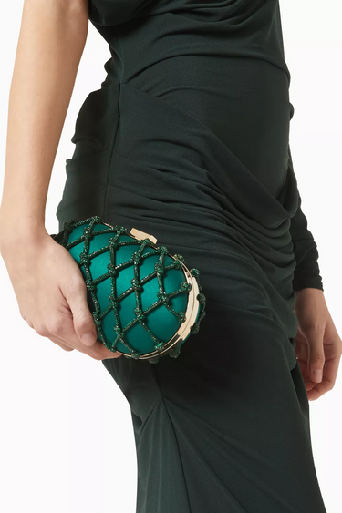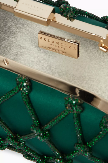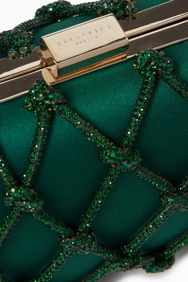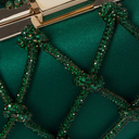 Erato Nodi Kristal İşlemeli El Çantası, mücevher tonlarında sateni ve kristallerle süslü düğümlü kafesiyle couture zarafeti sunar. Heykelsi kutu silueti ve ışıltılı omuz askısıyla gece davetleri için unutulmaz bir aksesuar.