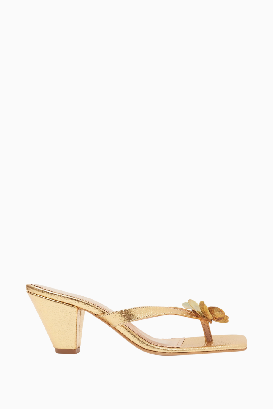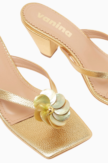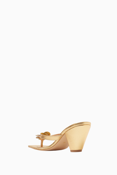 Vanina Fleur 55 thong mule sandalet, metalik deri dokusu ve kabuk çiçek süslemeleriyle modern feminenliği yansıtıyor. 55 mm kitten topuğu, kare burun formu ve yumuşak deri kayışlarıyla hem zarif hem de konforlu bir seçim sunarak özel davetlerde şıklığı garanti ediyor.