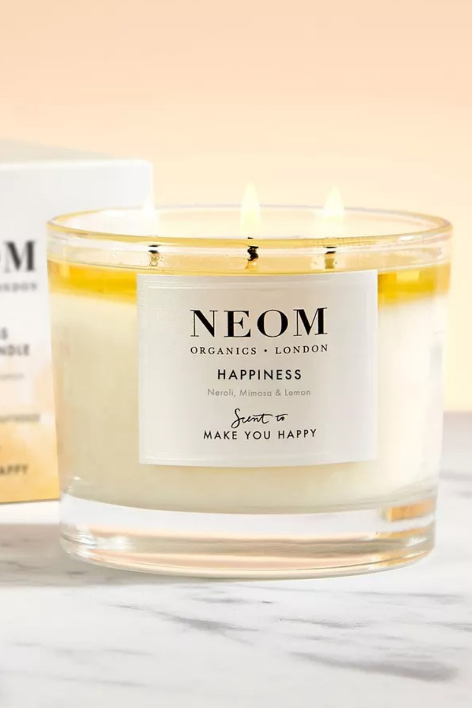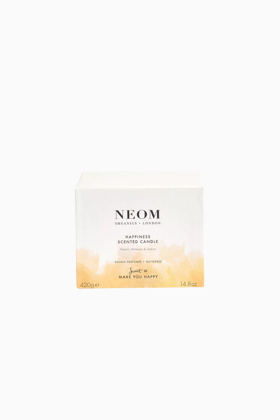 Neom Happiness Mum 420g, yedi saf esansiyel yağın benzersiz karışımıyla hazırlanmış %100 doğal bir mumdur. Beyaz neroli, mimoza ve limon notalarıyla evinizde pozitif, canlandırıcı ve neşeli bir atmosfer yaratır. 50 saat yanma süresi ve üç fitili ile uzun ömürlü kullanım sağlar.