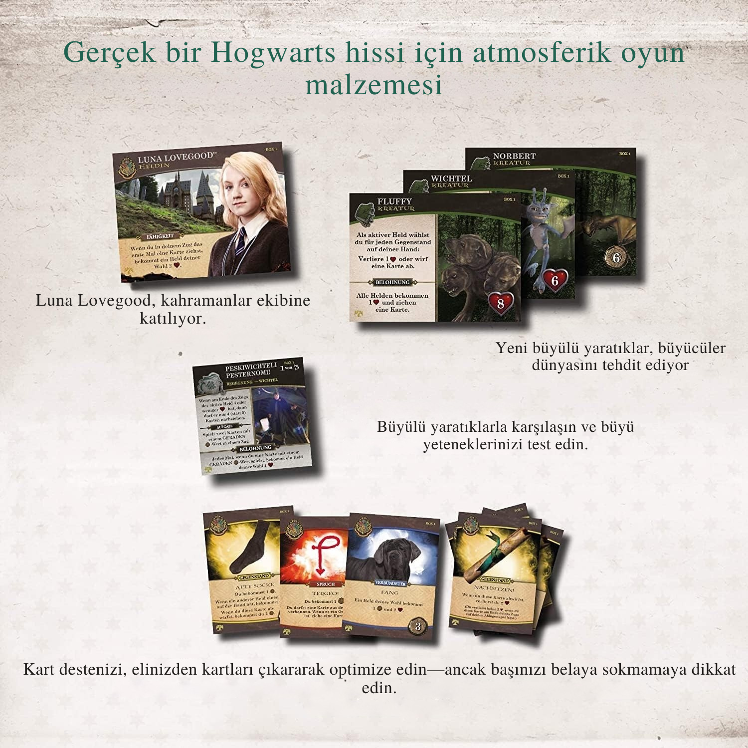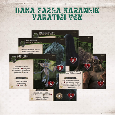 Özel Oyun İçeriği – 152 kart (40 küçük, 68 orta, 44 büyük), 1 zar, 4 oyun kutusu, 4 oyun kuralı, 12 etki belirteci, 1 arp ve 8 ekstra karton fiş içerir.