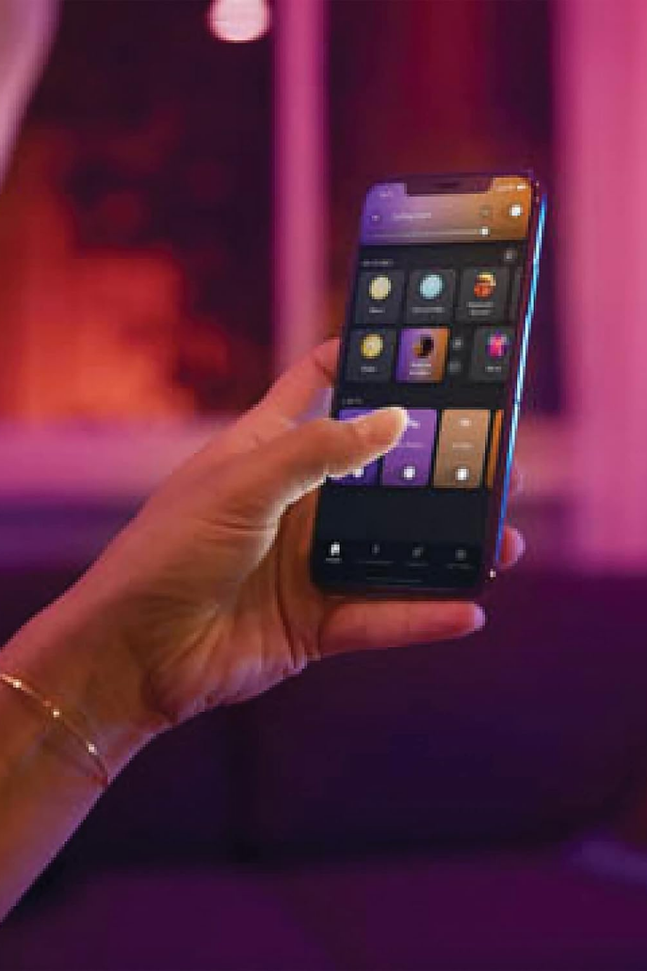 Philips Hue Sana duvar lambası, 16 milyon renk seçeneği ve tüm beyaz tonlarıyla uygulama üzerinden kontrol edilebilen dekoratif aydınlatma sunar. Bluetooth ve Alexa uyumludur.