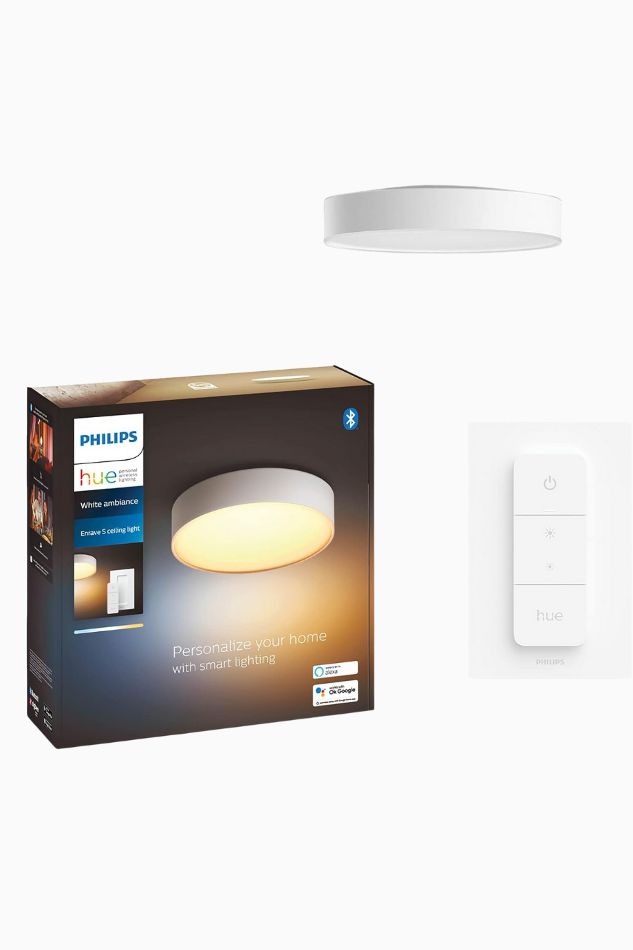Philips Hue White Ambiance Enrave Tavan Lambası S, tüm beyaz tonlarda kısılabilir akıllı aydınlatma sunar. Sesli asistan ve Hue uygulamasıyla kontrol edilebilir, kolay kurulumlu, enerji verimli ve modern tasarımlı bir akıllı tavan lambasıdır.