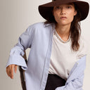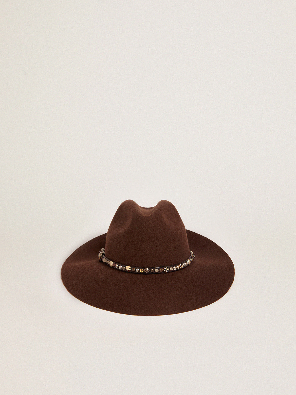 GOLDEN GOOSE'un kahverengi yün Fedora şapkası, siyah deri kayış üzerindeki renkli çiviler ve altın yıldız şeklinde gümüş saplama detayıyla zamansız bir stil sunar. %100 yün, İtalya üretimi.