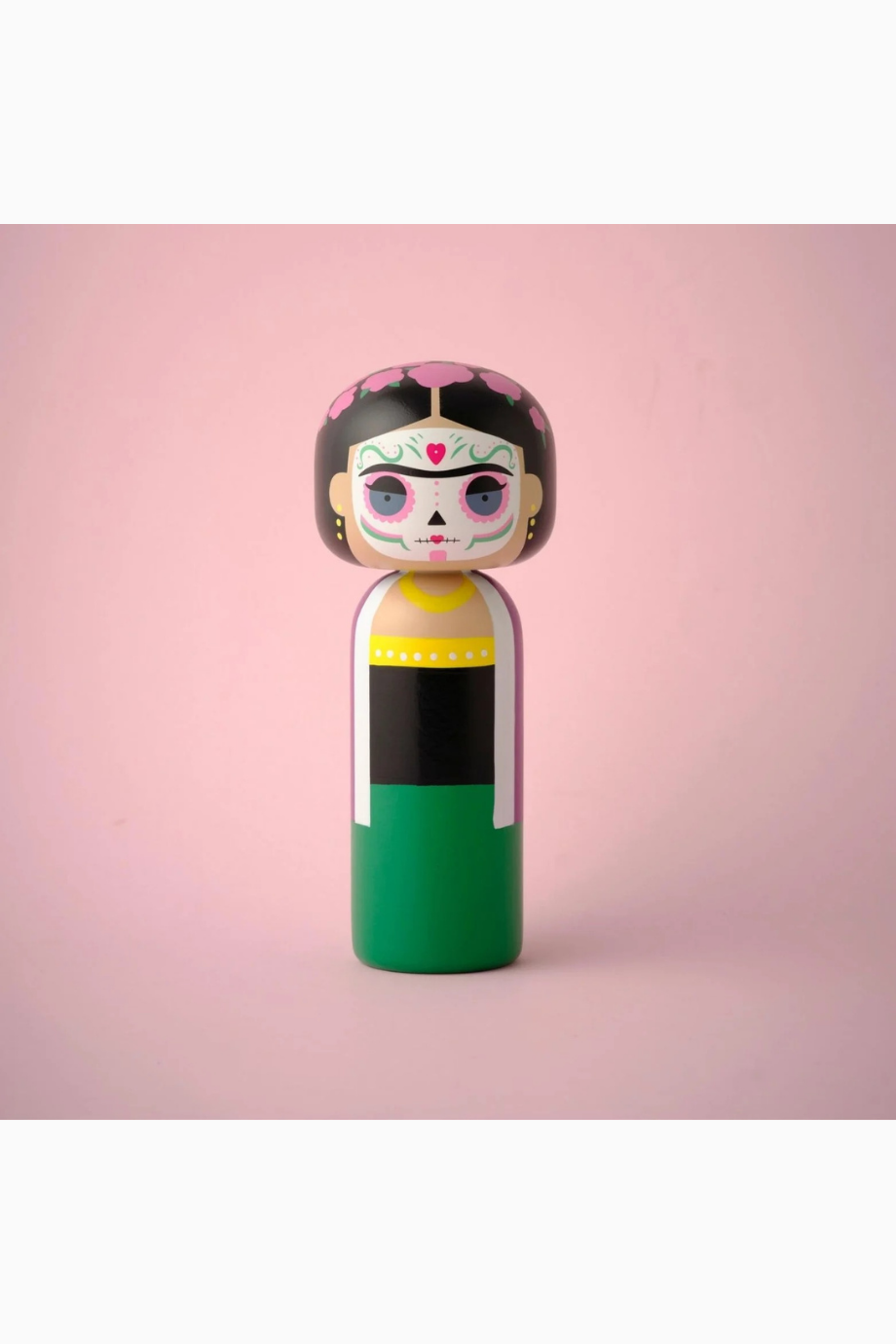 Kokeshi Frida Dia De Los Muertos Ahşap Figür, El Yapımı Koleksiyon Parçası 14,5 cm