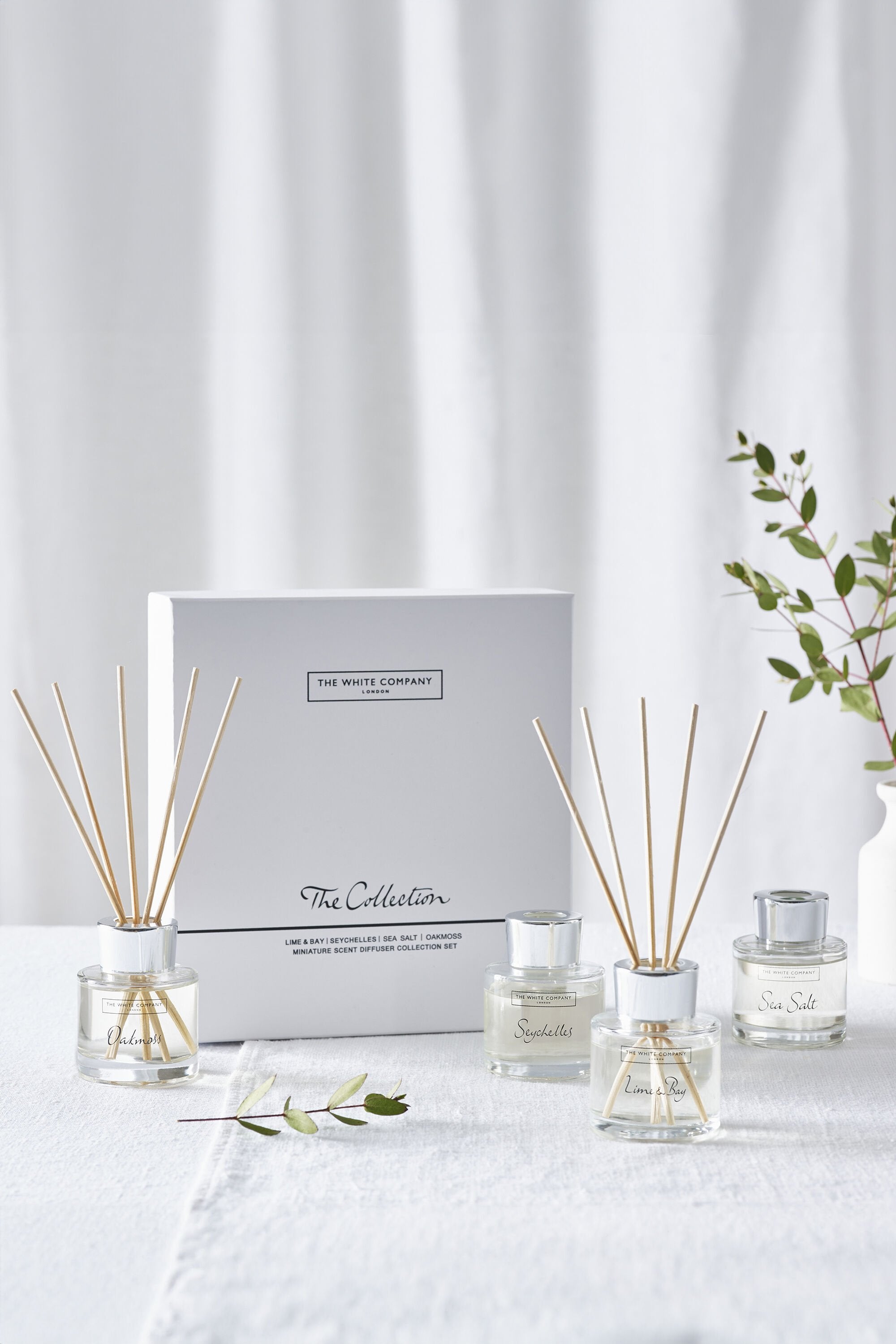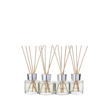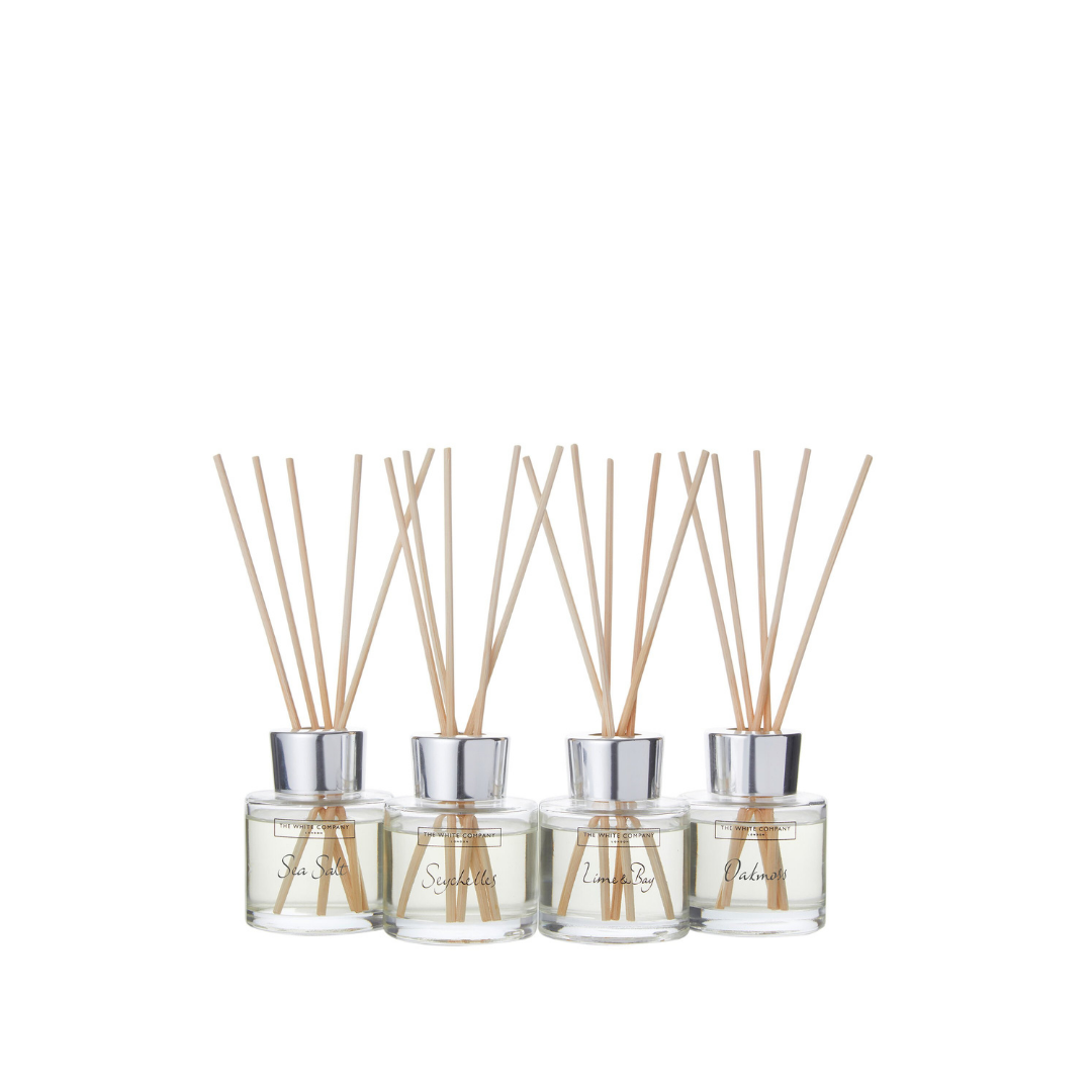 The White Company'nin Koleksiyon Mini Difüzör Seti, Seyşeller, Lime & Bay, Deniz Tuzu ve Meşe Yosunu gibi çok satan kokularıyla her odada farklı bir atmosfer yaratır. 50ml'lik dört difüzör, 4 hafta boyunca yumuşak ve kaliteli kokular sunar.