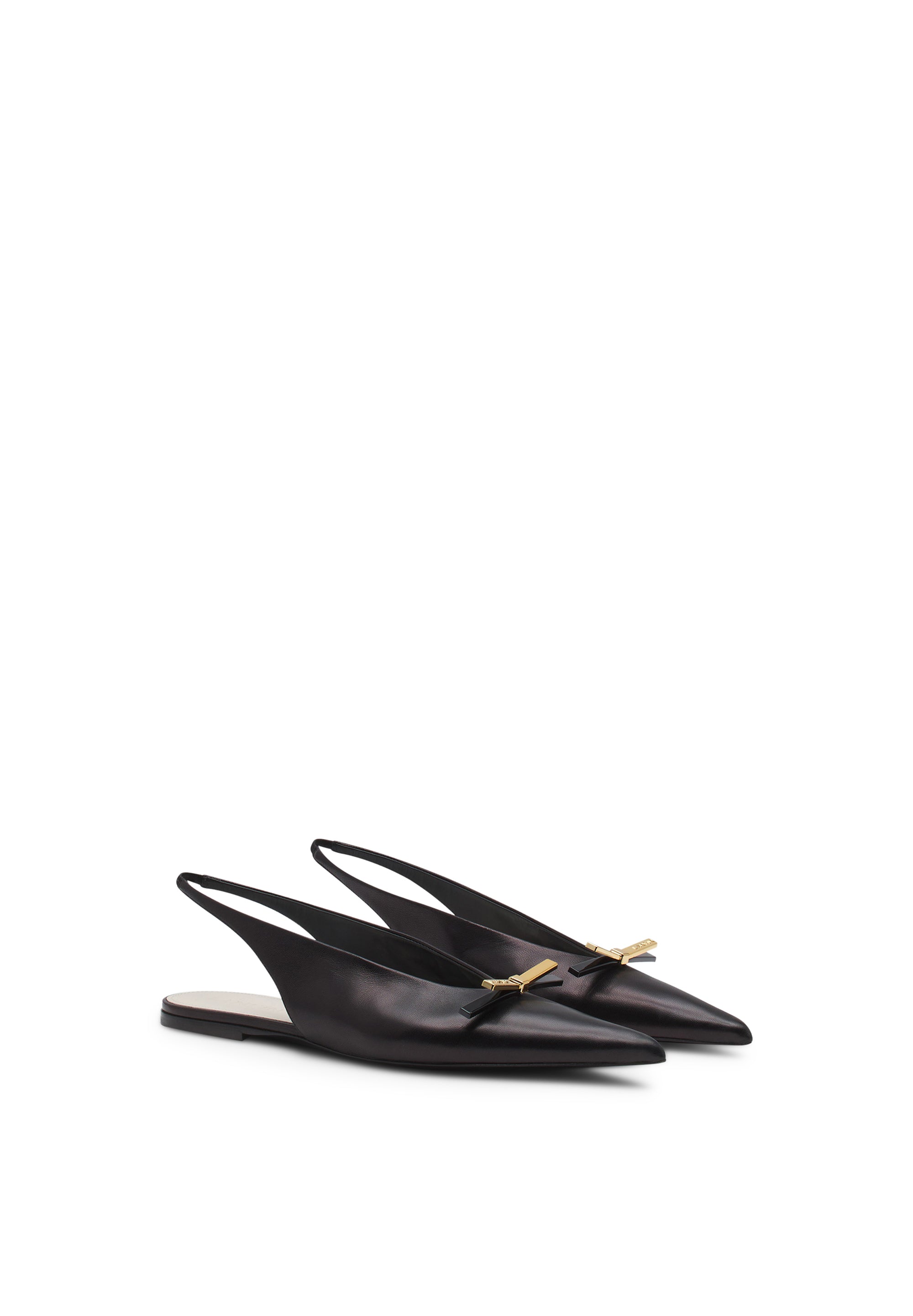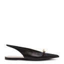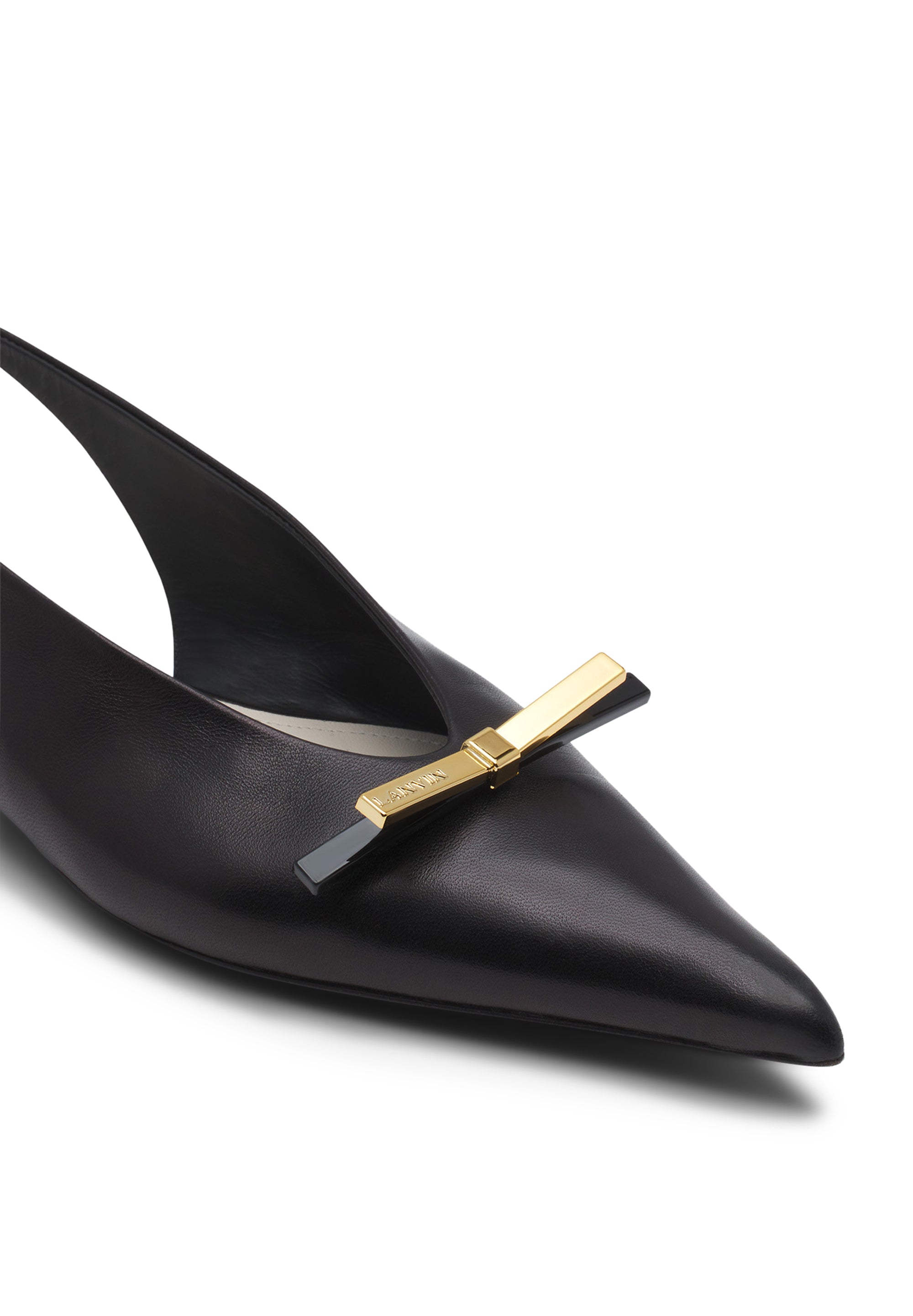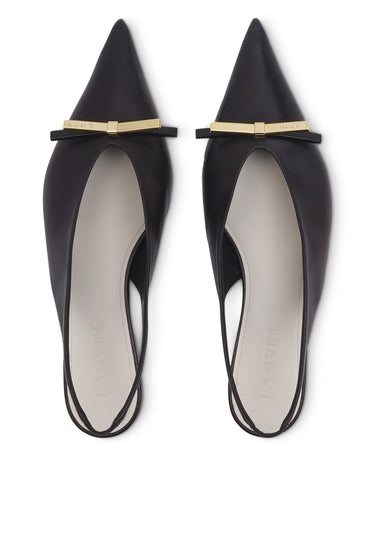 Lanvin İkili fiyonk slingback mules, imza niteliğindeki çift fiyonk detayıyla zamansız bir cazibe sunuyor. Bu tasarım, Jeanne Lanvin ile kızı Marguerite arasındaki bağı ve Lanvin Evi'nin zengin mirasını yansıtıyor. Pürüzsüz deriden üretilen bu ayakkabı, Lanvin logosunu taşıyan şık altın ve gümüş fiyonkla parlıyor. Sivri burun yapısı ve düz topuğu, şık ve rahat bir uyum sağlarken, deri iç tabanı ve elastik kayışı pratiklik katıyor. Zarif bir akşam kıyafetiyle kombinlemek için ideal olan bu slingback, şıklığı ve konforu bir araya getiriyor.
