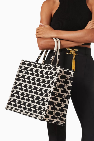 Elisabetta Franchi Large Monogram Tote Bag, İtalyan zarafetini jakarlı kanvas kumaş üzerinde ikonik EF logolarıyla buluşturur. Geniş iç hacmi sayesinde günlük ihtiyaçları rahatlıkla taşırken, sofistike tasarımıyla modern ve lüks bir stil sunar. Günlük şehir hayatında ya da seyahatlerde şıklık ve fonksiyonelliği bir araya getiren vazgeçilmez bir aksesuardır.