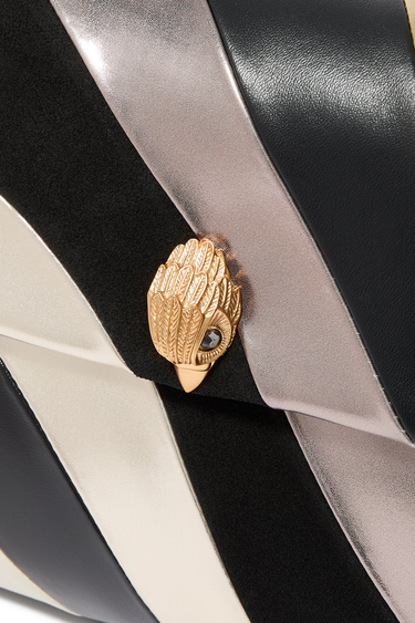 Kurt Geiger Large Soft Kensington Bag, metalik deri yüzey ve siyah tonlarla modern bir estetik sunar. İkonik fırçalanmış altın kartal başı detaylarıyla güç ve zarafeti birleştirir. Çift zincir askı, yumuşak dolgu ve manyetik kapamalar konfor ve fonksiyonelliği garantiler.