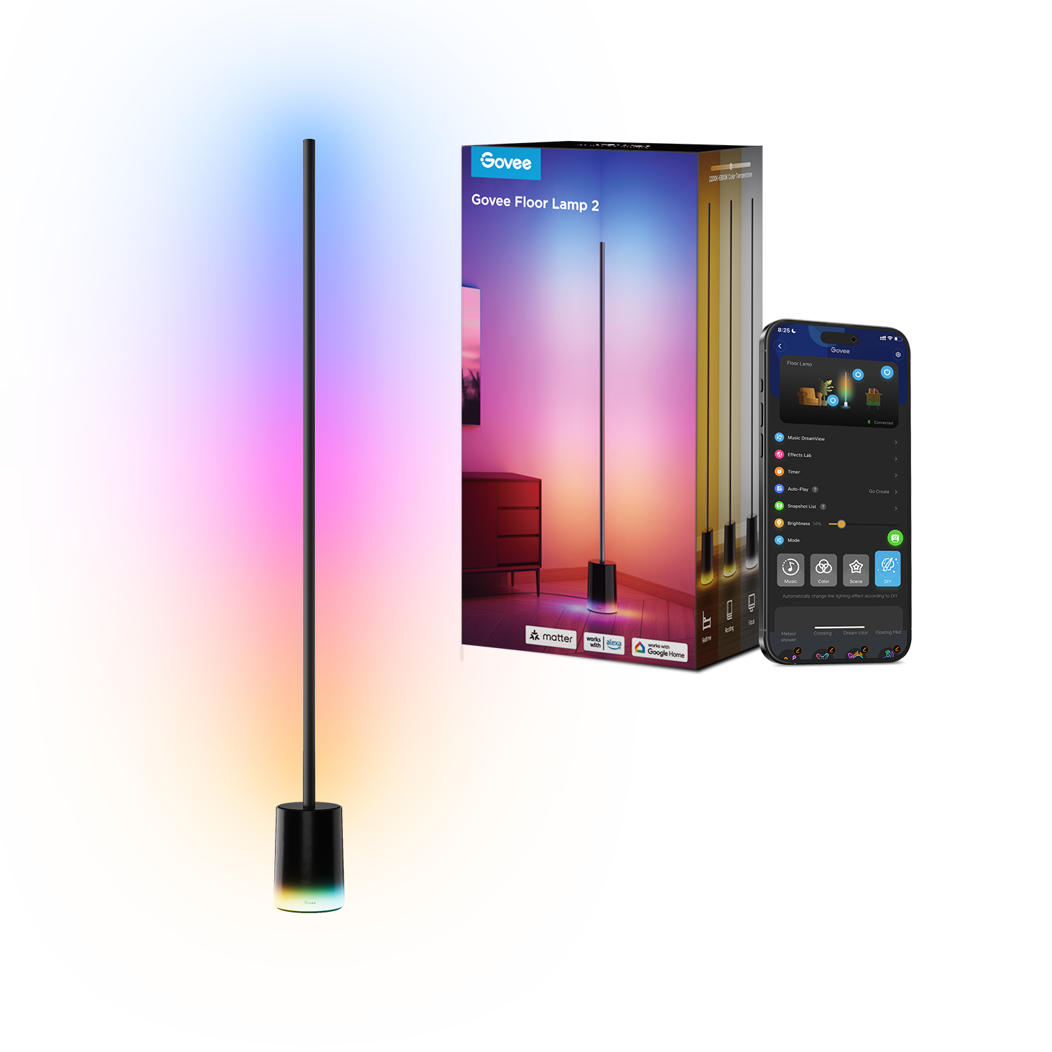 Govee RGBIC LED zemin lambası 152 cm boyuyla 16 milyon renk, kısılabilir ışık, müzik senkronizasyonu ve Matter, Alexa & Google uyumluluğu ile modern yaşam alanlarını aydınlatır.