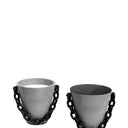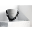 - El yapımı gri beton kaplama, endüstriyel şıklık sunan zincir kulp ve ağır çelik kapak.