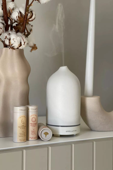 Appellation'ın Luna Stone Esansiyel Yağ Difüzörü, minimalist ve zarif bir tasarım ile evinize veya iş yerinize huzur katıyor. Fısıltı kadar sessiz, ince LED ışığı ile odanızı rahatlatıcı bir aromatik sisle doldurur.