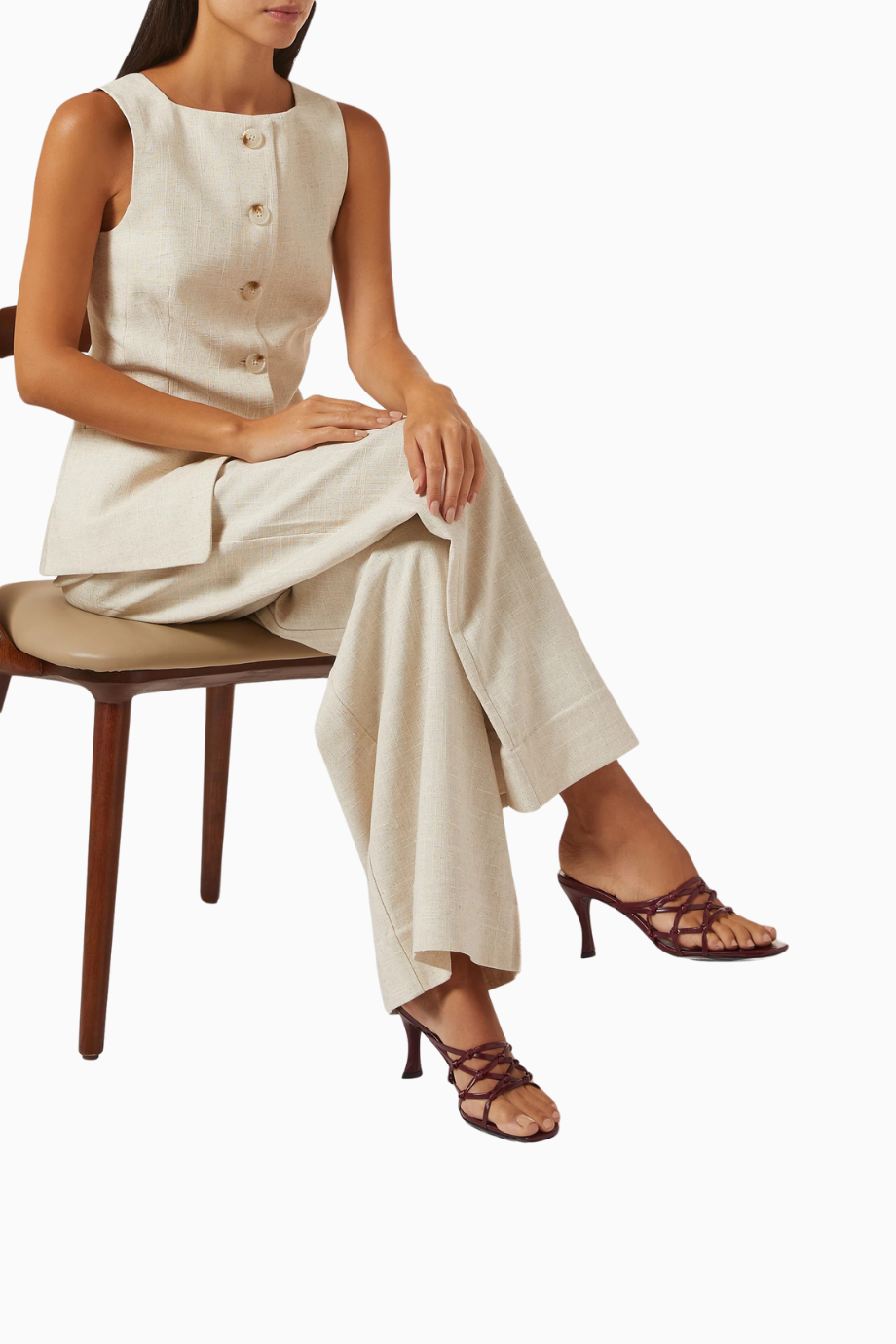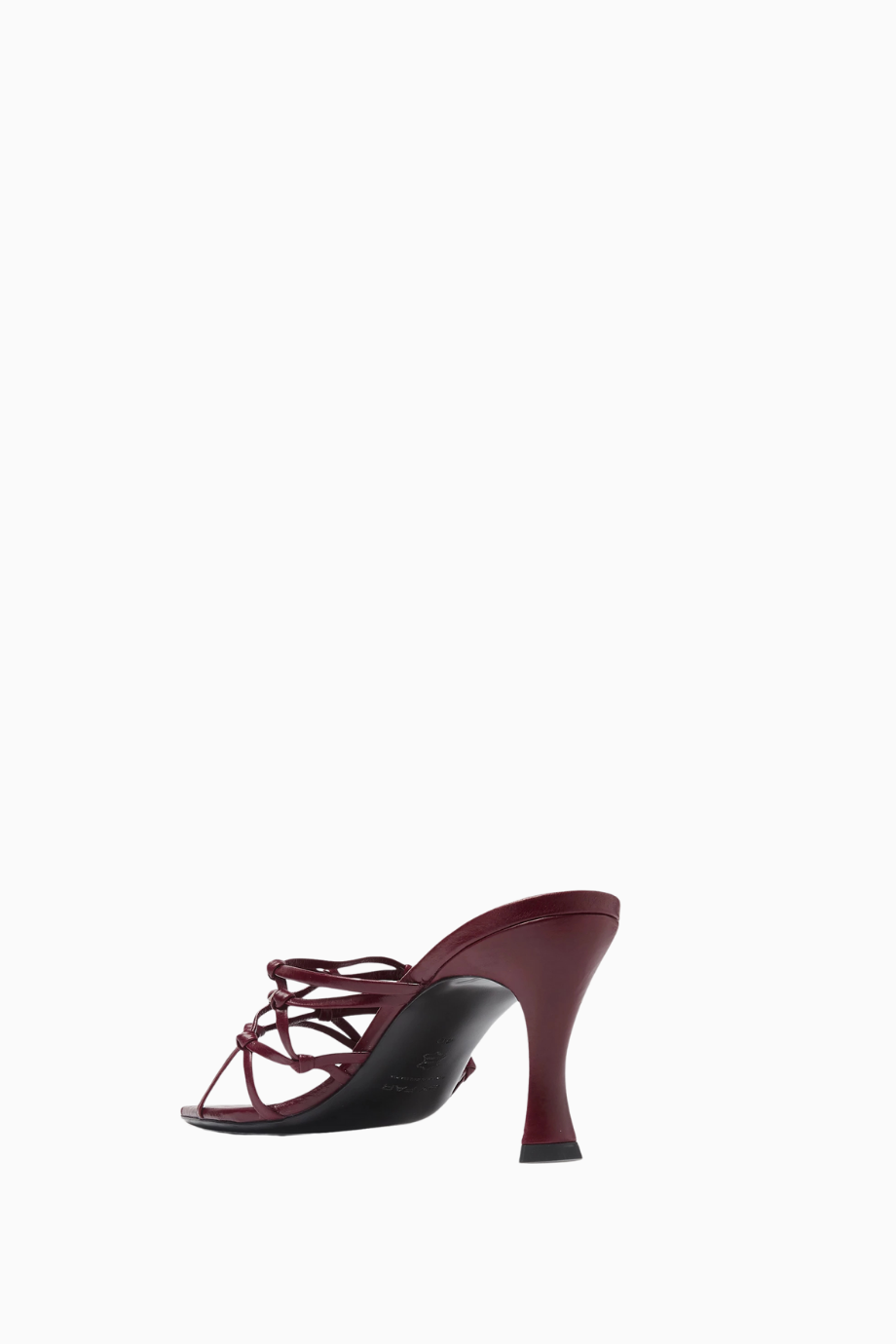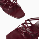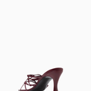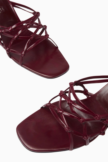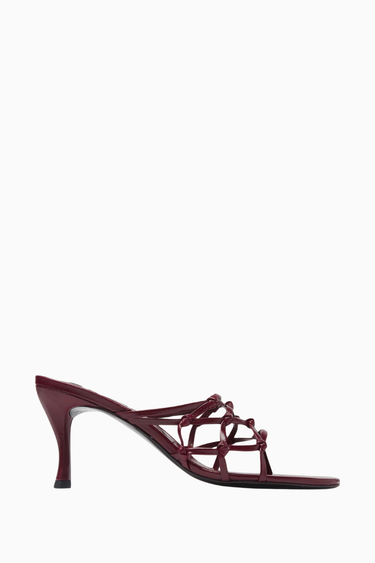 By Far Malaya Mules, kırışık bordo deri ve şık örgü bant detaylarıyla modern feminen bir dokunuş sunar. Kare burun ve soyut orta topuk tasarımıyla hem ofis hem de gündüz şıklığına uygundur.