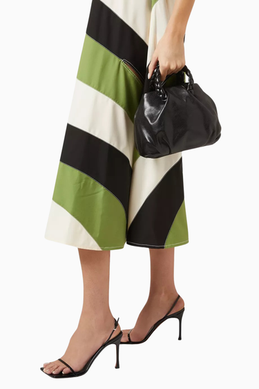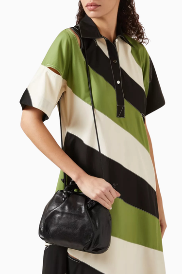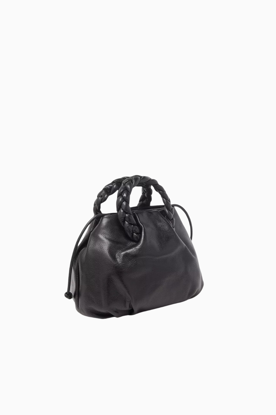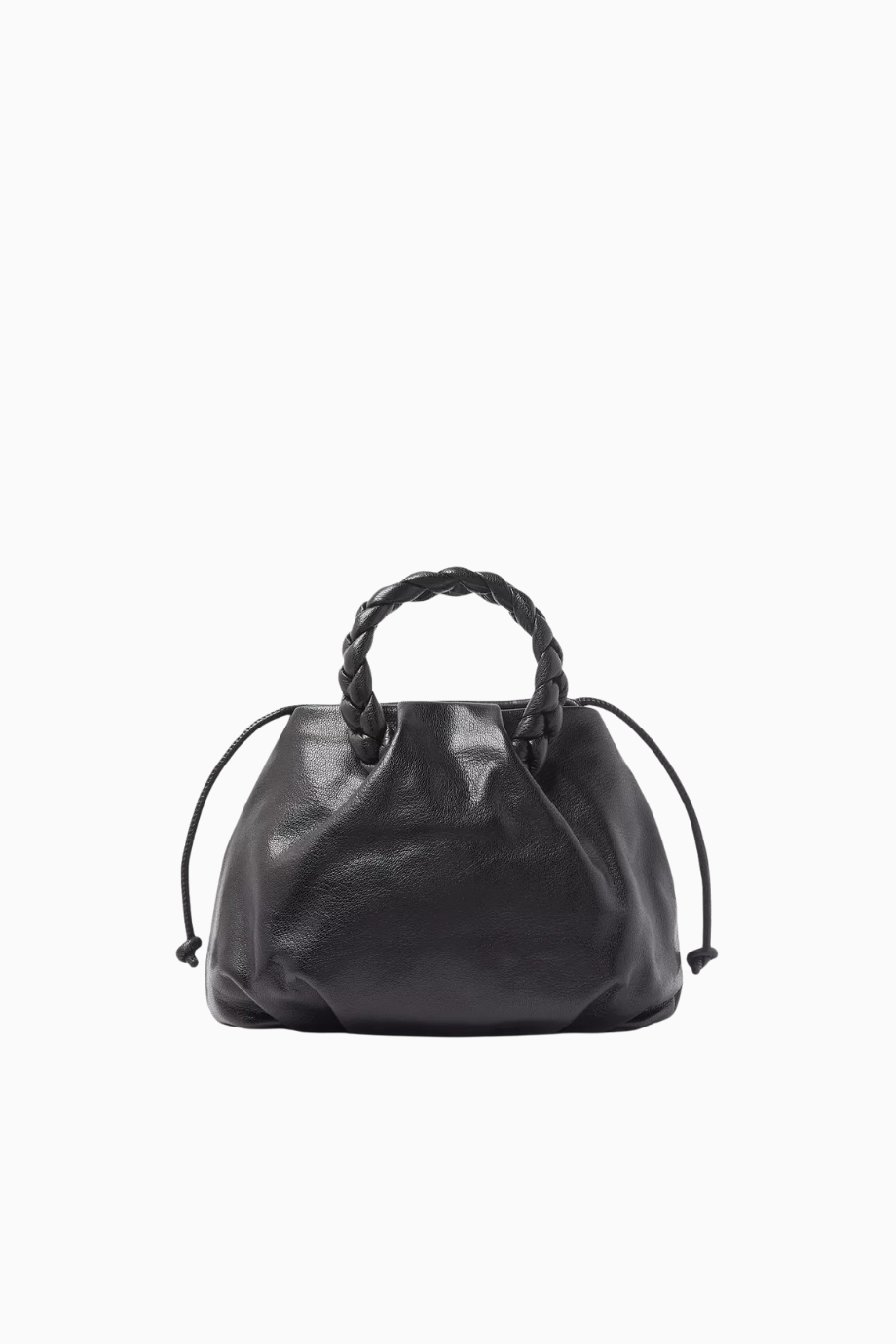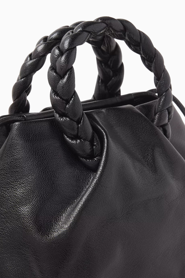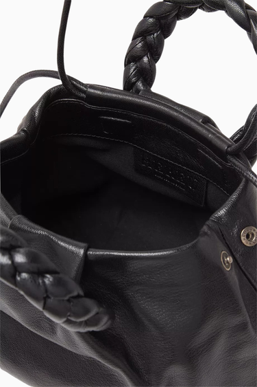 Hereu Medium Bombon çanta, parlak siyah kuzu derisi ve örgü sap detaylarıyla öne çıkar. Yuvarlak ve pileli silueti, çıkarılabilir omuz askısı ve mıknatıslı kapanışıyla hem şık hem de işlevsel bir seçenek sunar. İspanyol zanaatkârlar tarafından elde üretilmiştir.