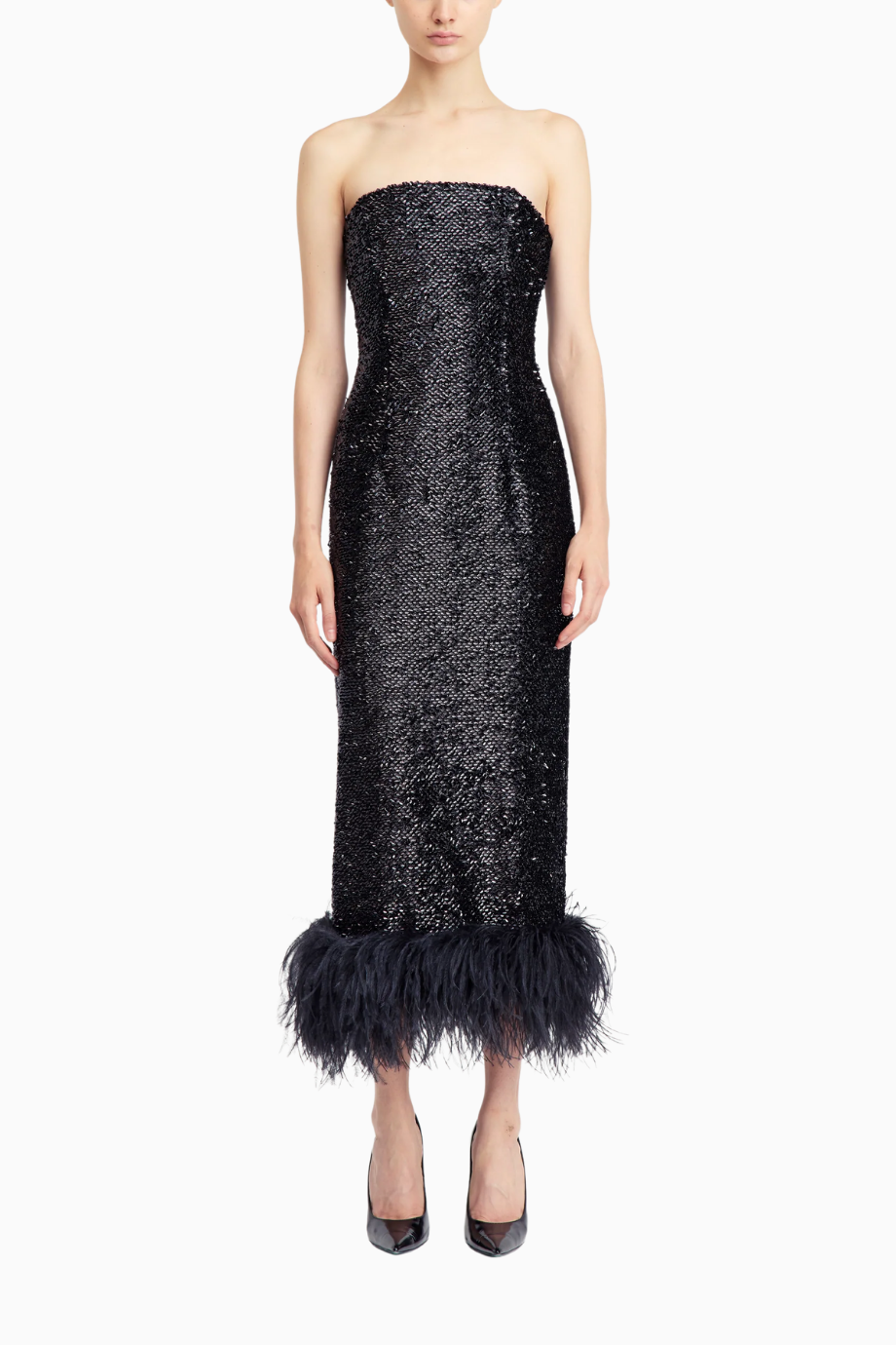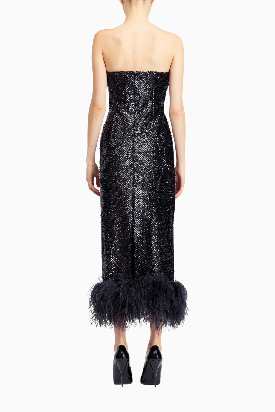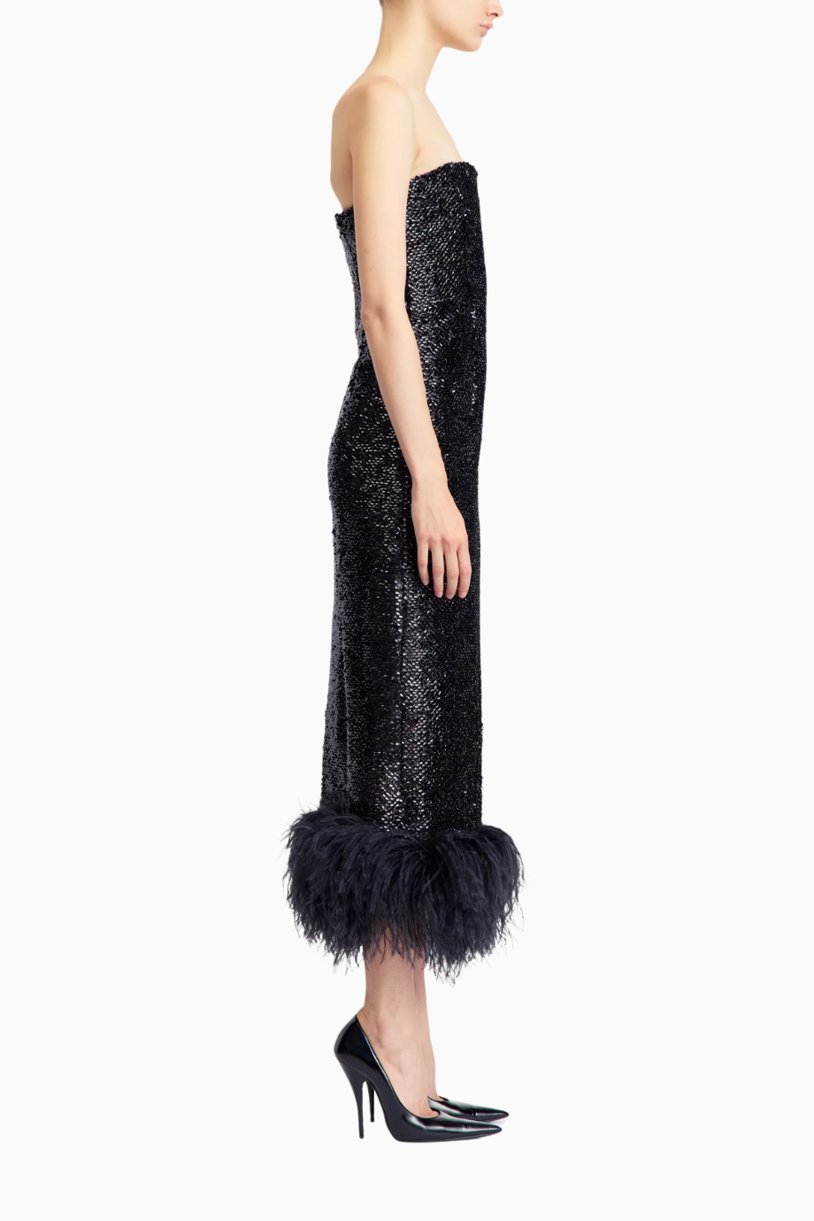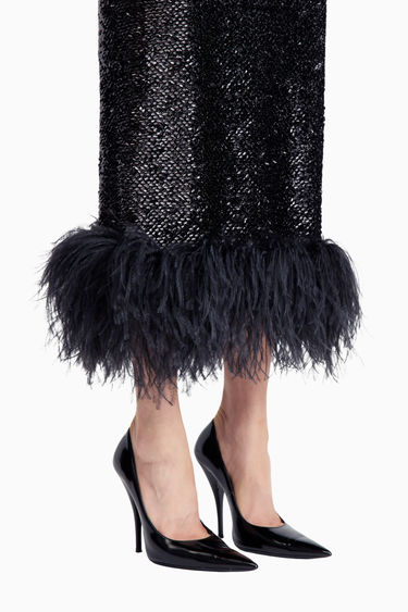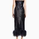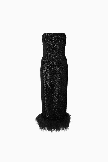 Minelli Midi Elbise, siyah dokulu payet kumaştan üretilmiş, straplez ve vücuda oturan bir tasarımdır. İç korsesiyle yapılandırılmış form, tüylü etek detayıyla zarif bir hareket ve dokunsal kontrast sunar.