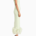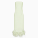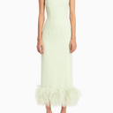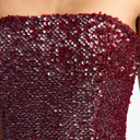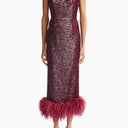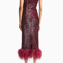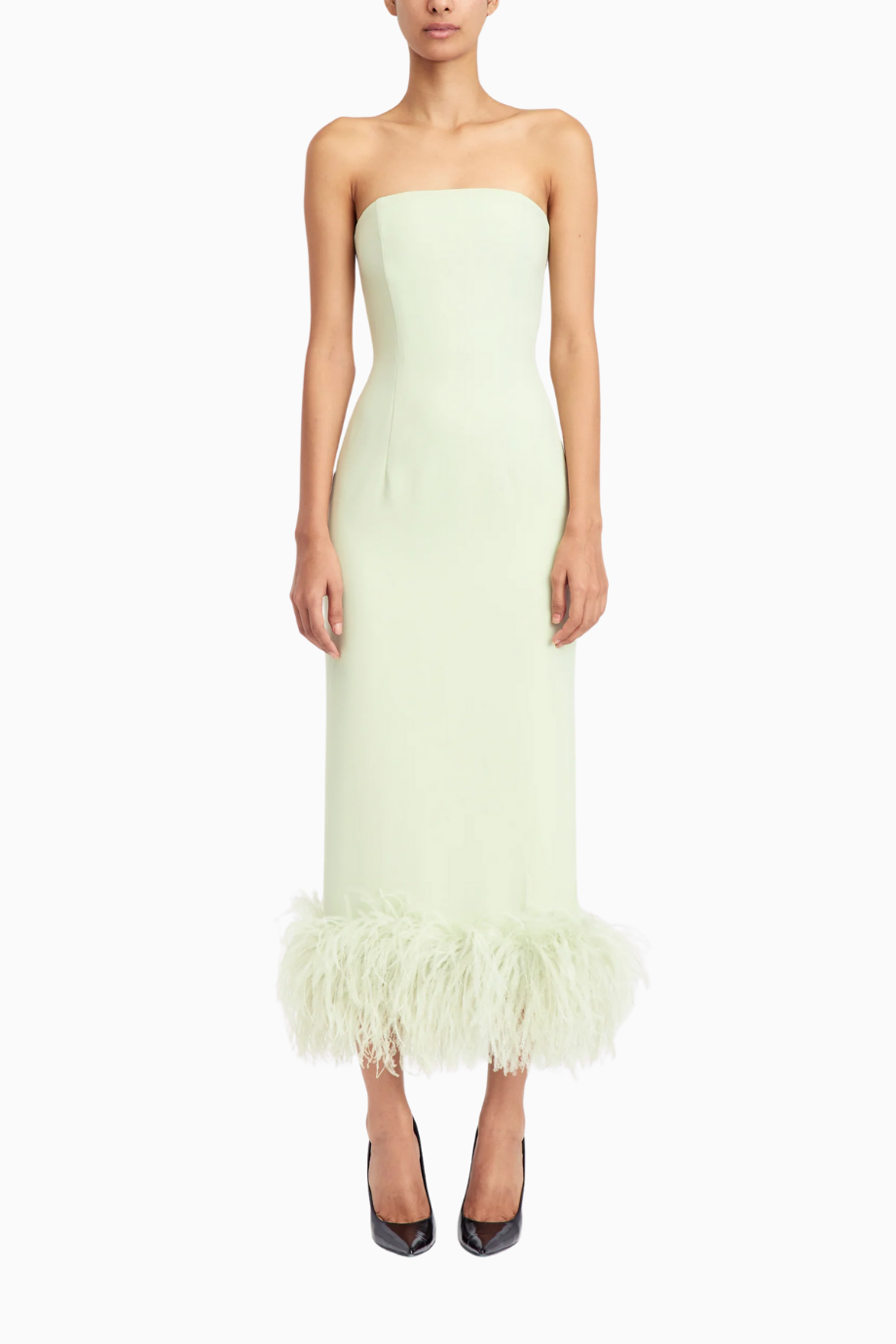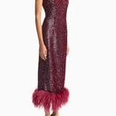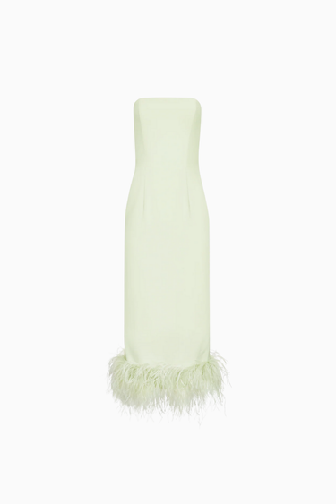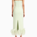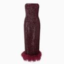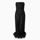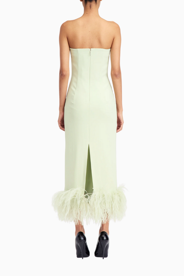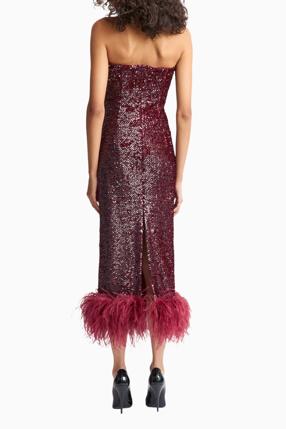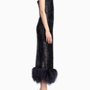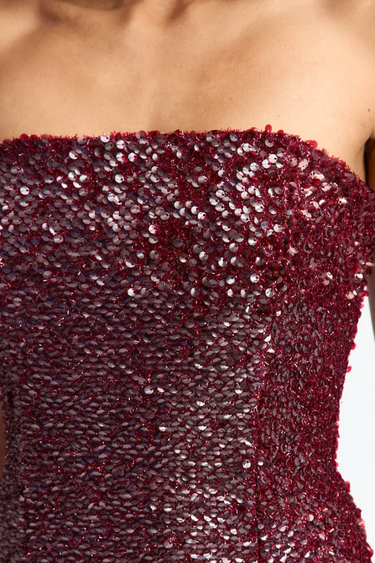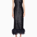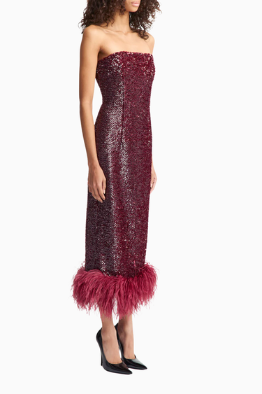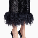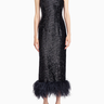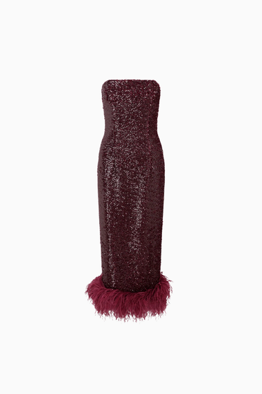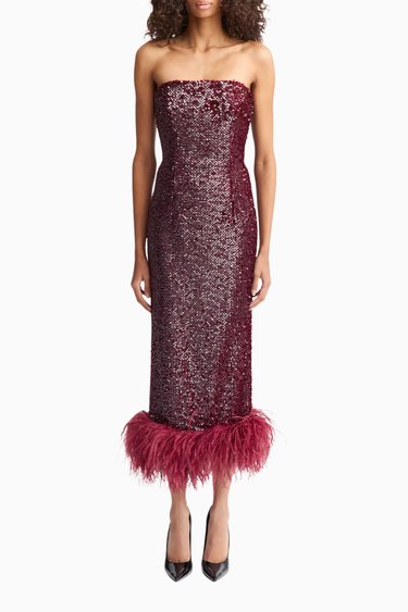 Minelli Midi Elbise, siyah dokulu payet kumaştan üretilmiş, straplez ve vücuda oturan bir tasarımdır. İç korsesiyle yapılandırılmış form, tüylü etek detayıyla zarif bir hareket ve dokunsal kontrast sunar.