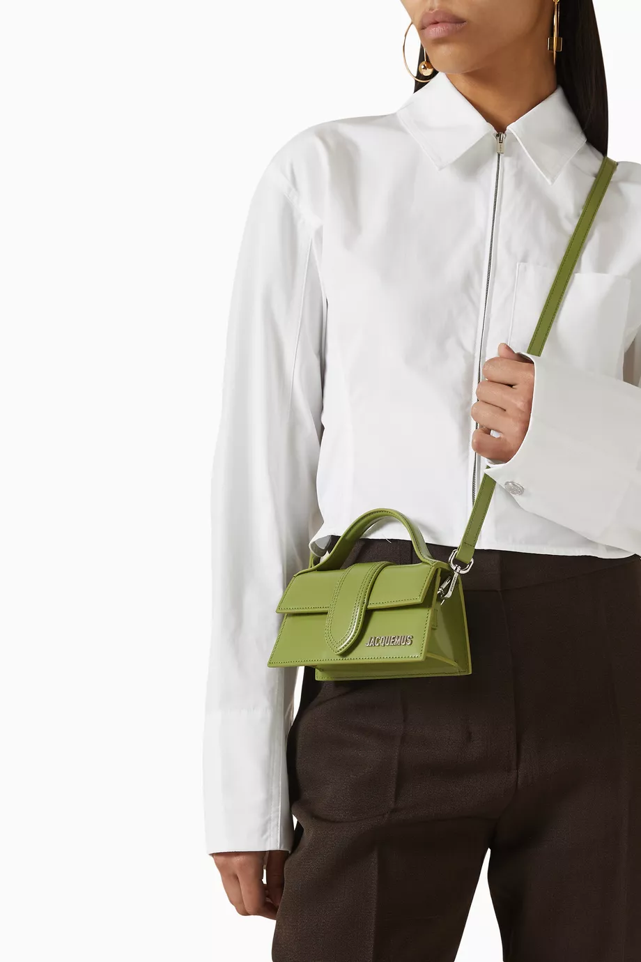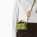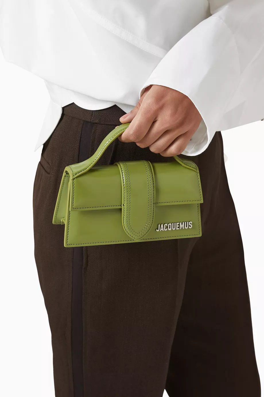 Jacquemus’un Mini Le Bambino çantası, parlak dana derisi ve gümüş tonlu logo detayıyla modern bir zarafet sunuyor. Kompakt boyutu, çıkarılabilir askısı ve üst sapıyla hem elde hem omuzda taşımaya uygun. Günlük şıklığı ve akşam stilini kusursuzca tamamlar.