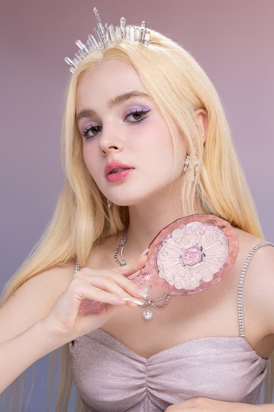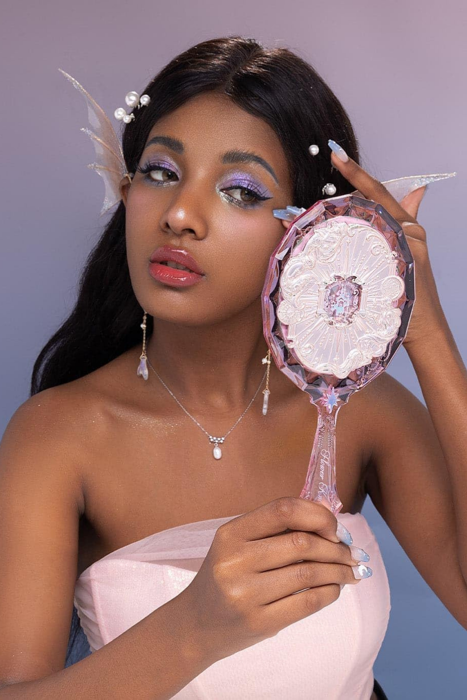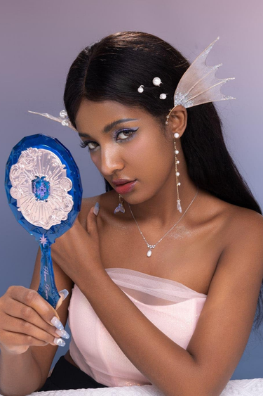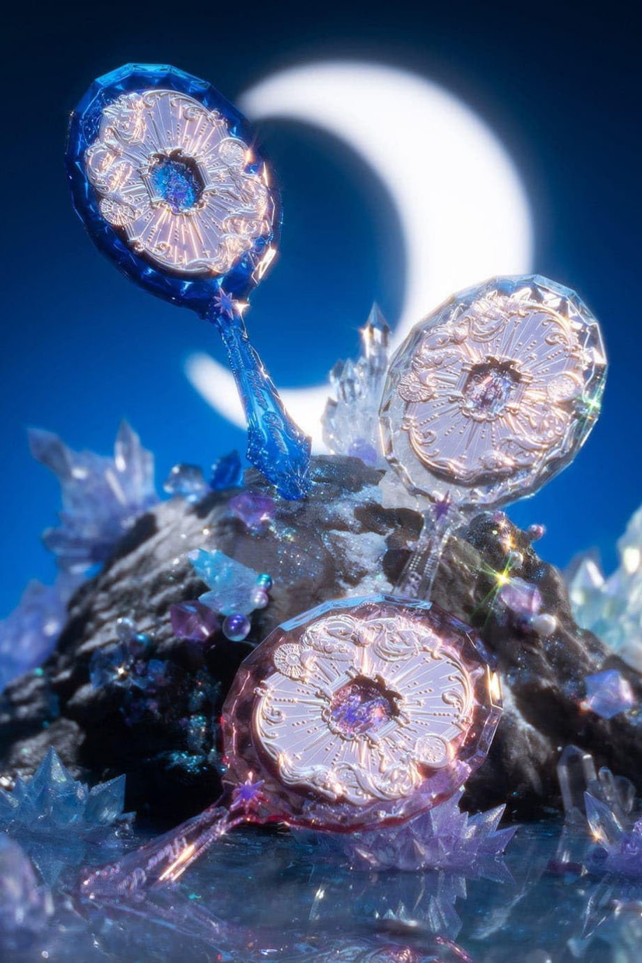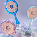 Flower Knows Moonlight Mermaid El Aynası, üç boyutlu kabartma detayları ve mücevher kesimi ilhamlı görünümüyle lüks bir tasarım sunar. Kalın akrilik yapısı, mermaid oymaları ve ışıltılı yüzeyiyle koleksiyon değeri taşıyan zarif bir aksesuar.