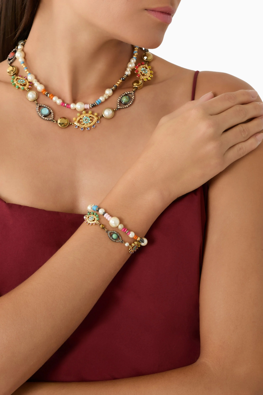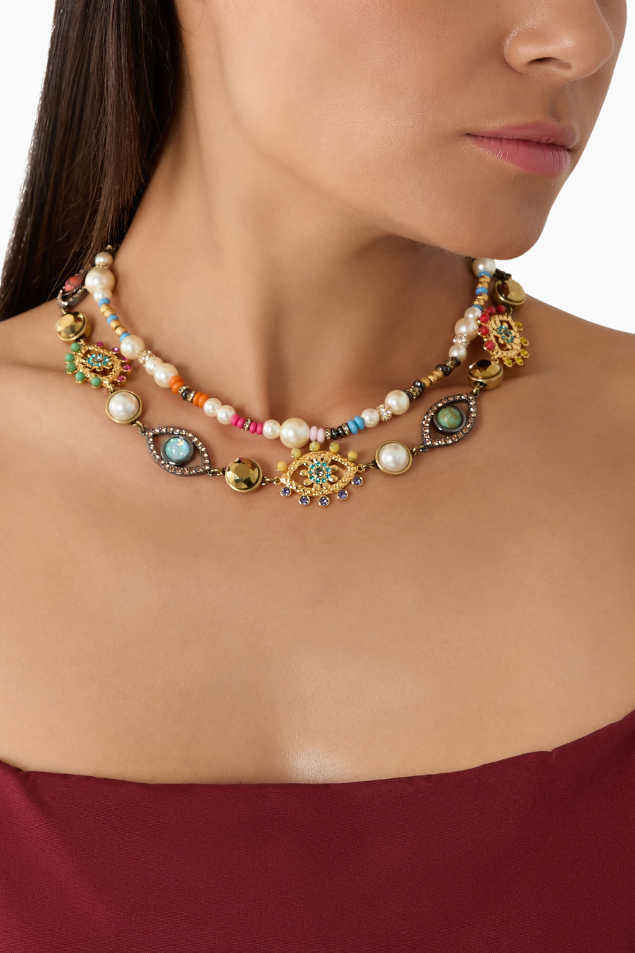 Multi-Strand Eye Necklace, Çok Sıralı Göz Kolye, İncili, Kristalli ve Nazar Boncuklu