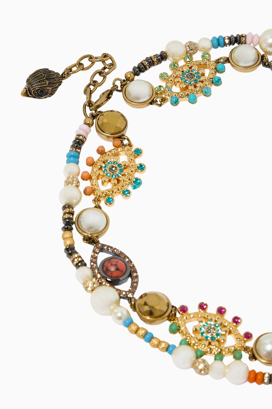 Kurt Geiger Multi-Strand Eye Necklace, inciler, kristaller ve renkli nazar boncuklarının birleştiği iki katmanlı tasarımıyla şıklık ve mistik enerjiyi bir arada sunar. 40,64 cm uzunluk, istakoz toka.