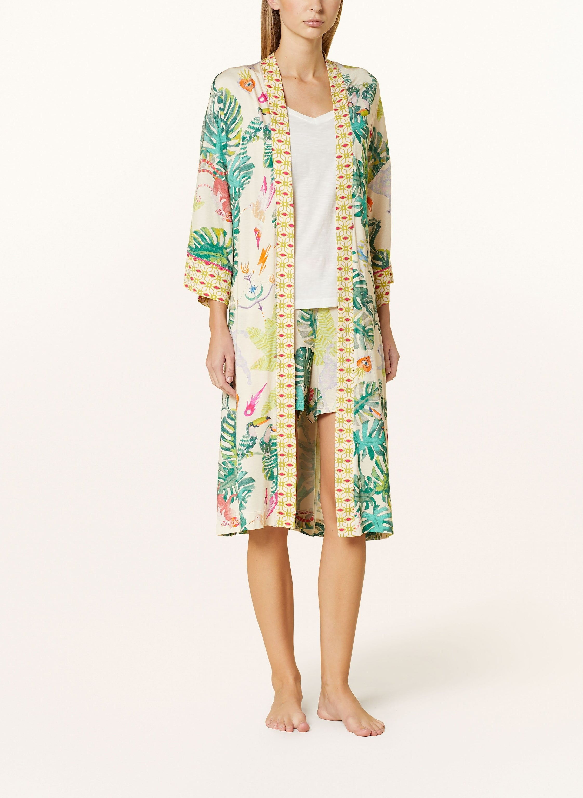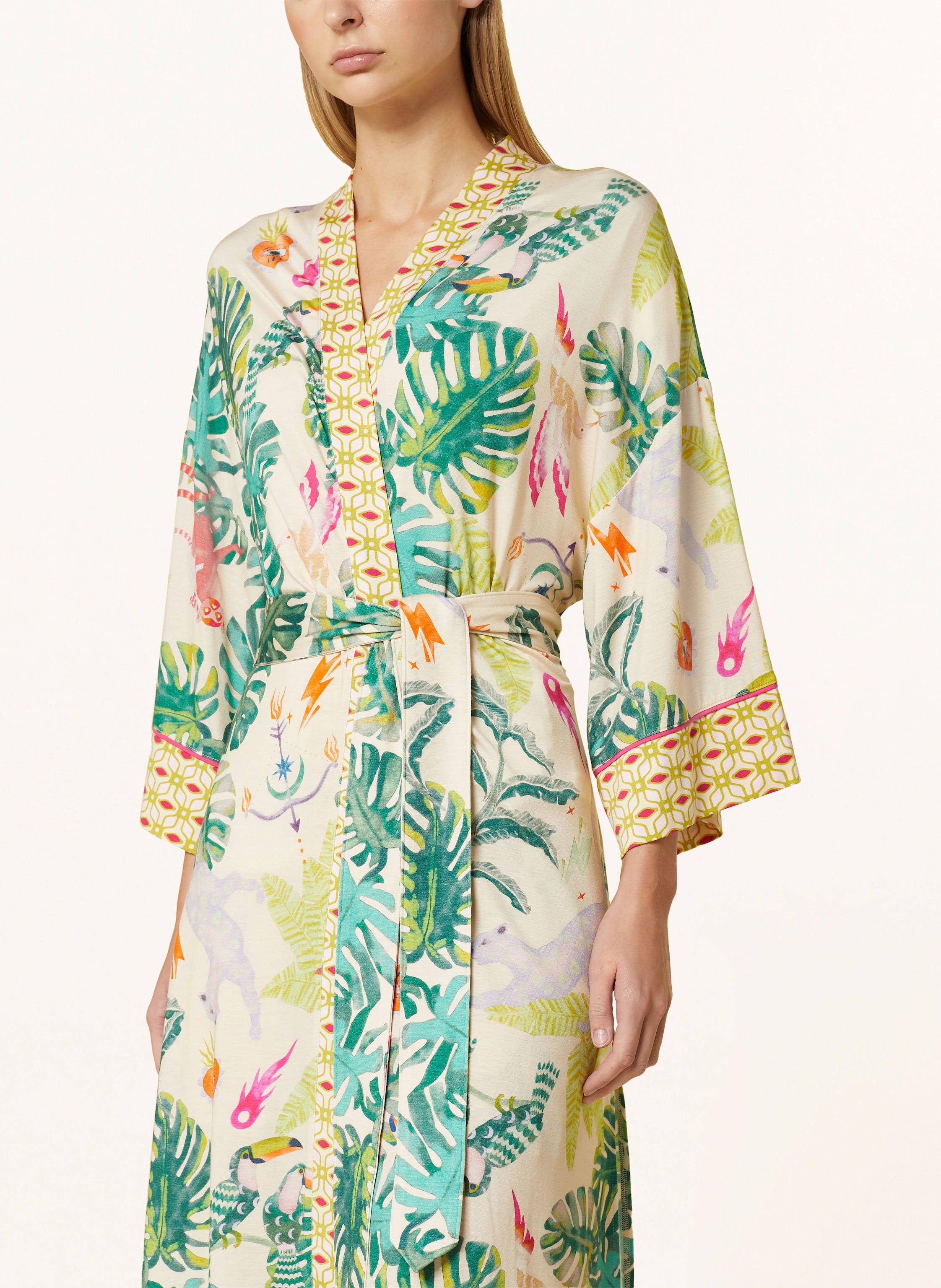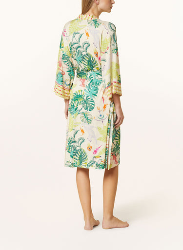 mey Mystic Jungle kadın kimono, yumuşak modal karışımlı jersey kumaşıyla rahatlık sunar. Kontrast borulama detayları ve şal yaka tasarımıyla şık ve feminen bir görünüm sağlar.