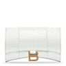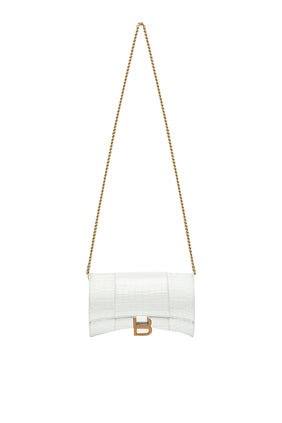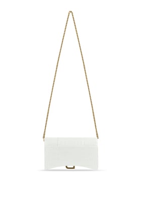Bu Balenciaga Saat Camı Cüzdan Zincir Çantası, timsah derisi dokusundan üretilmiştir. Altın renkli donanımlara, sivri metal kapamaya, altı iç kart yuvasına ve bir yaman cebine sahiptir.