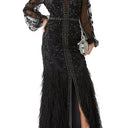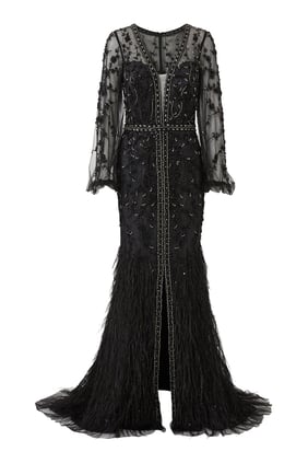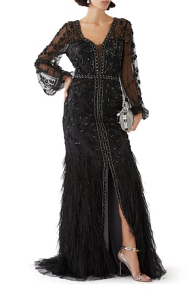 Lüks bir dünyaya adım atın, Jovani'nin Tüy ve Kristal Detaylı Maxi Elbisesi, şatafatın zarif bir örneğidir. İnce tül kumaştan üretilmiş olan elbisenin karmaşık detayları ve hafif tüyleri Hollywood ihtişamını yansıtır. Cesur küpeler ve şık sandaletlerle kombinleyerek gala ve resmi davetlerde etkileyici bir görünüm elde edebilirsiniz.
