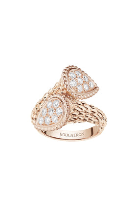 Bu Boucheron Toi Et Moi Serpent Bohème S Yüzük, 18 ayar pembe altın ile tasarlanmıştır. İki yuvarlak elmas kaplı motif ve dokulu bir halka içerir.