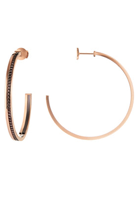 Parlak pembe altın halkanın üzerine yerleştirilen oluklu kahverengi PVD şeridi, renk ve doku arasında muhteşem bir etkileşim yaratır. Şık ve minimal bir siluete sahip olan bu küpeler, sade bir zarafet hissi yayar.