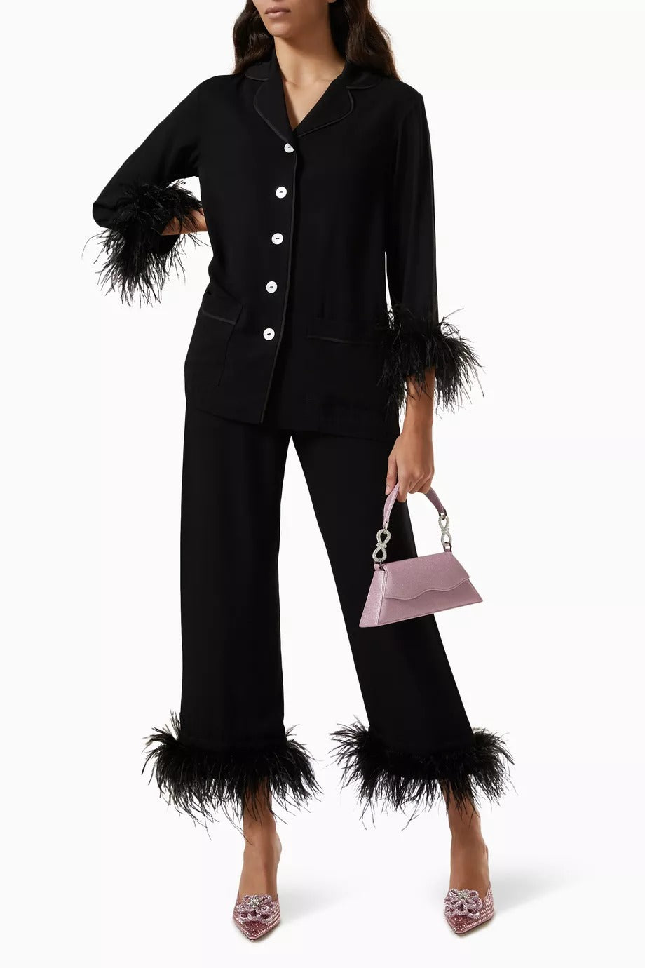 Ev şıklığını bambaşka bir seviyeye taşıyan Sleeper Party Pijama Takımı, konfor ve zarafeti bir araya getiriyor. İpeksi dokulu viskondan üretilen bu iki parçalı takım, düğmeli gömlek ve bol paça pantolondan oluşur. Çıkarılabilir devekuşu tüyü detayları, en rahat anlarınıza bile sofistike bir dokunuş katıyor. İster evde, ister özel davetlerde stil sahibi bir görünüm için idealdir.