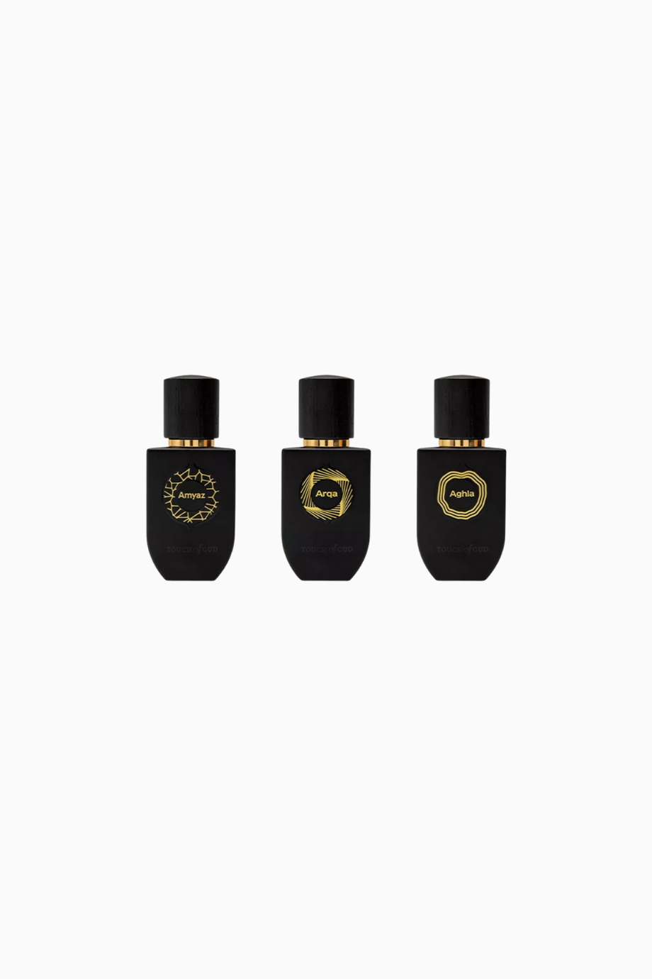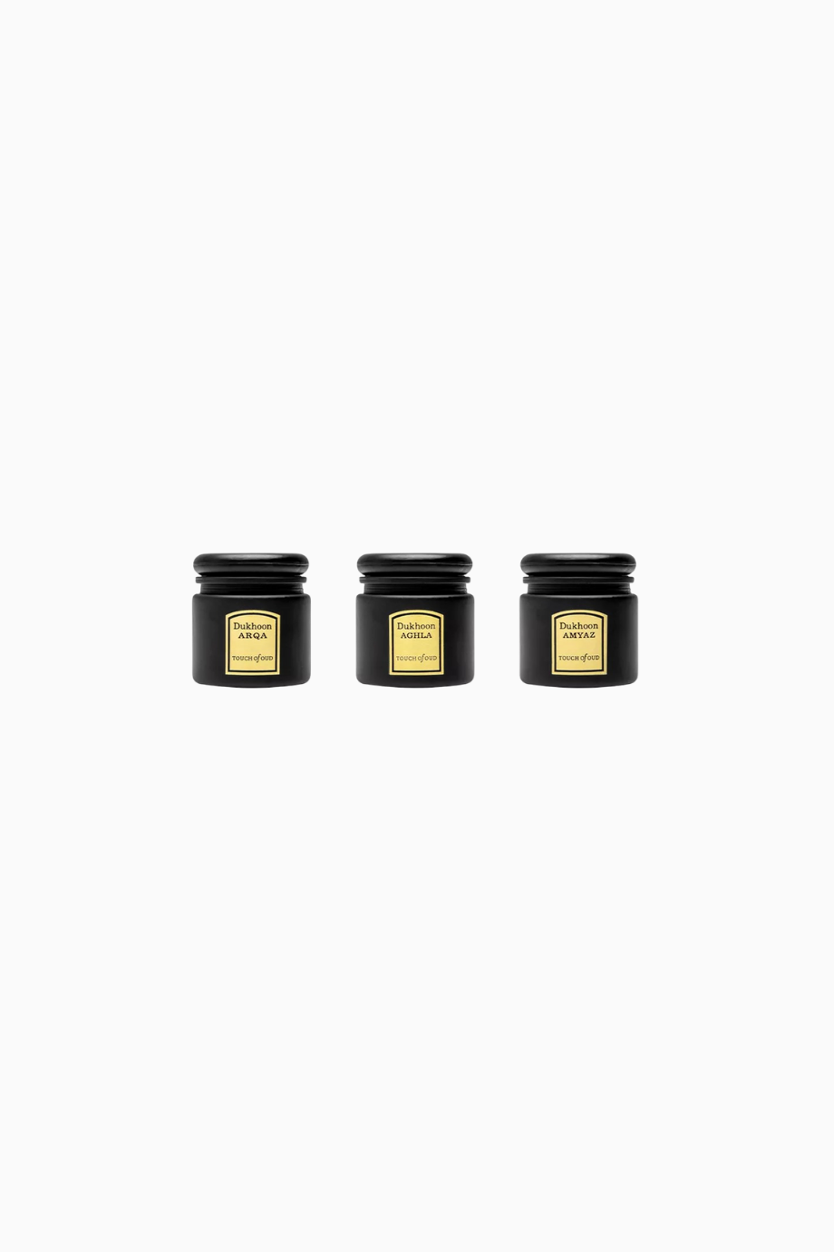 Touch of Oud Perfume & Dukhoon Hediye Seti, üç parfüm ve üç dukhoon seçkisi ile zengin bir koku deneyimi sunar. Burner, kömür, maşa ve çakmakla eksiksiz bir set olarak hediye için idealdir.