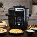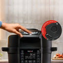 Bulaşık makinesinde yıkanabilen pişirme kabı, buharlama/hava fritözü rafı, hava fritözü sepeti ve düdüklü tencere kapağı.